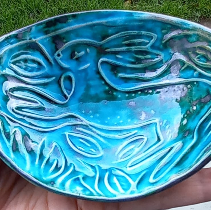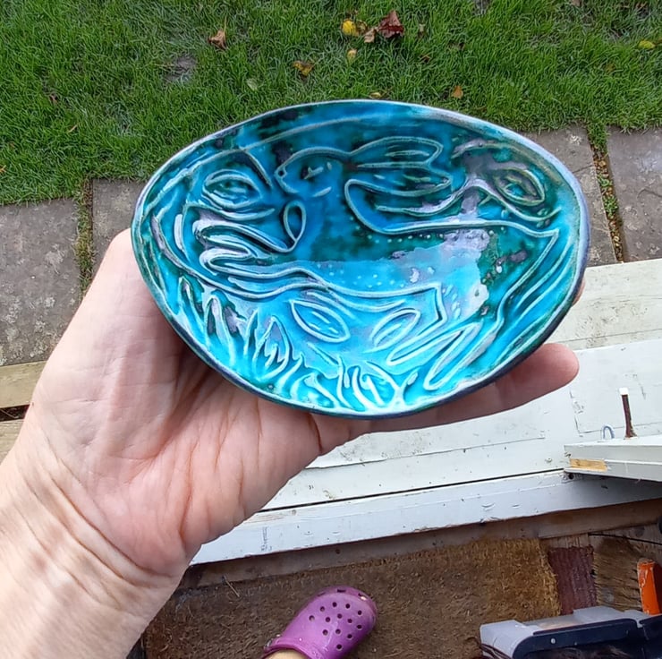 Hand made palm sized bowl with raised relief image of a hare .Glazed in a bright turquoise glaze. Reverse in brown slip with raised relief.Will be carefully packed and posted.