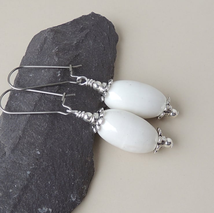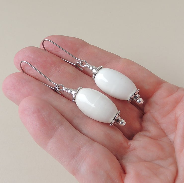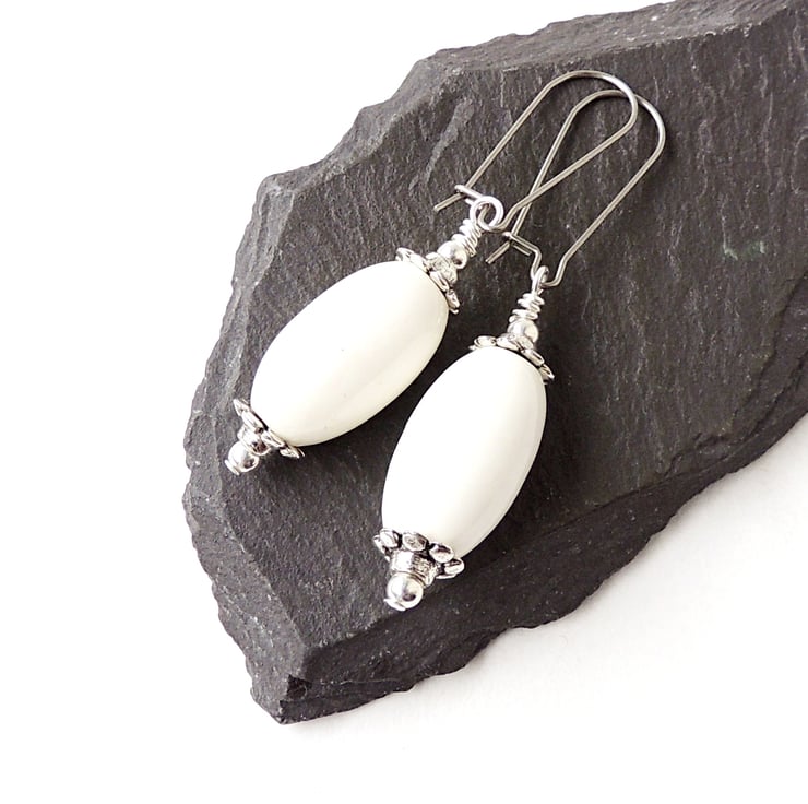 These white drop earrings have white glass beads and antique silver plated bead caps on stainless steel kidney ear wires.