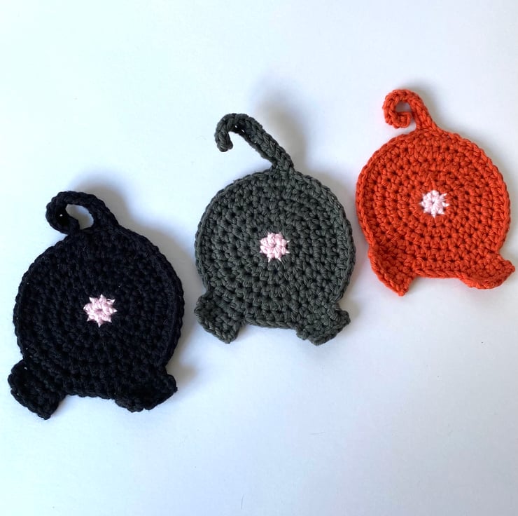 Hand crocheted by hand in organic 100% cotton, these coasters are washable for continuous use. Colours Black, Charcoal Grey, and Ginger (red/orange). Size is approximately just under 4" (10cm) in length excluding the tail.