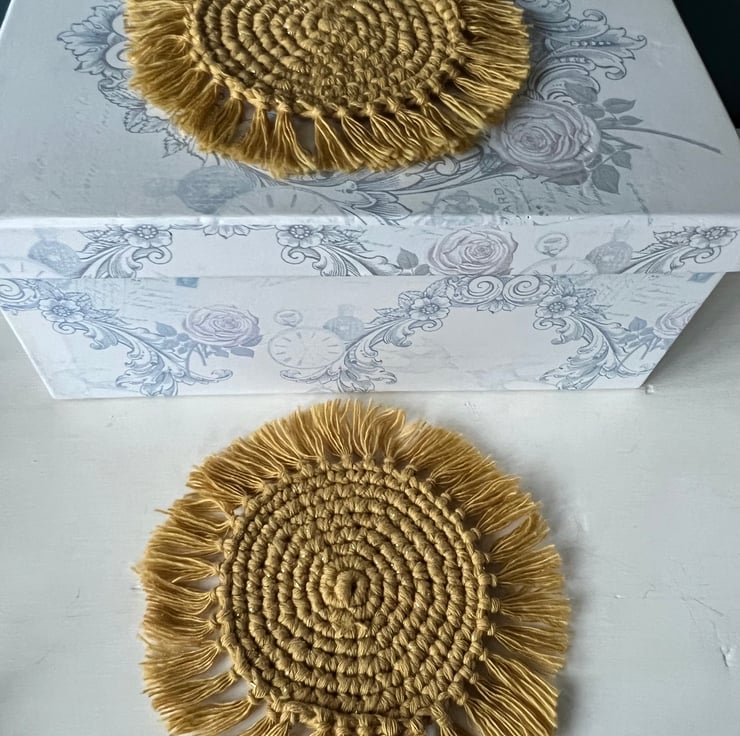Our handmade cotton fringed coasters are the perfect little gift for the Christmas season. Handmade using gold coloured cotton yarn with a gold metallic thread running through it perfect for a glitzy festive Christmas.