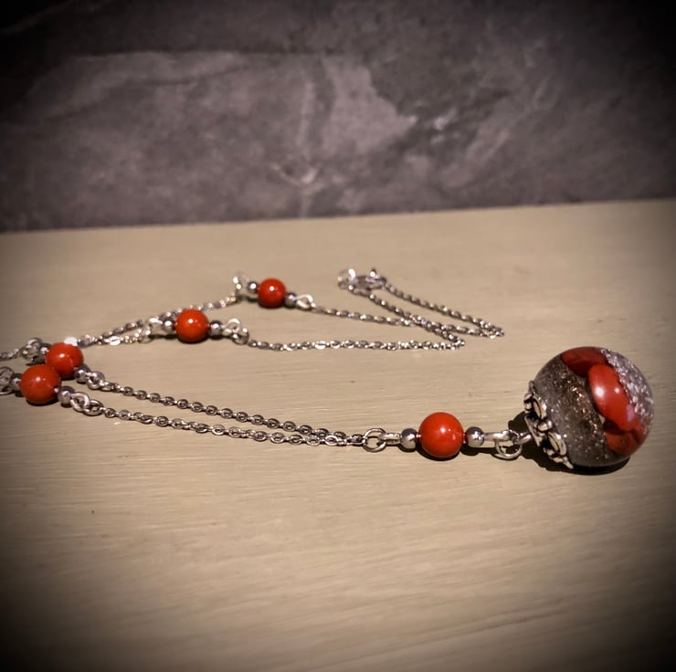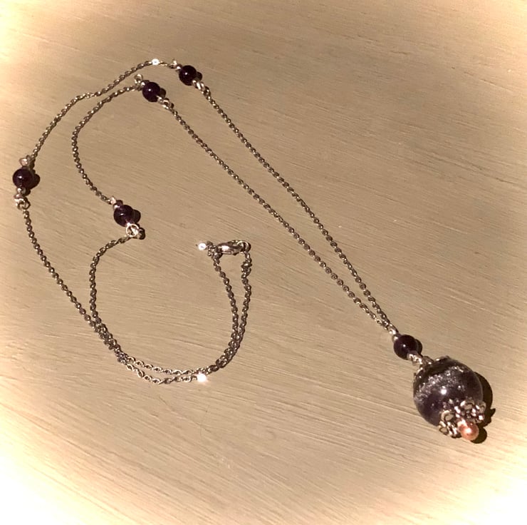You may choose from a variety of crystals, including Clear Quartz, Rose Quartz, Amethyst, Black Tourmaline, Red Jasper, Carnelian, Amber, Green Agate, Lapis Lazuli, Sodalite, White Howlite, Tiger's Eye and Turquoise. Two stainless steel chain design options are also available.