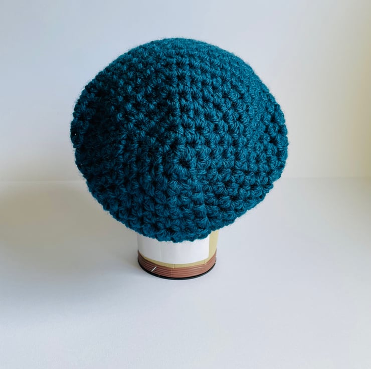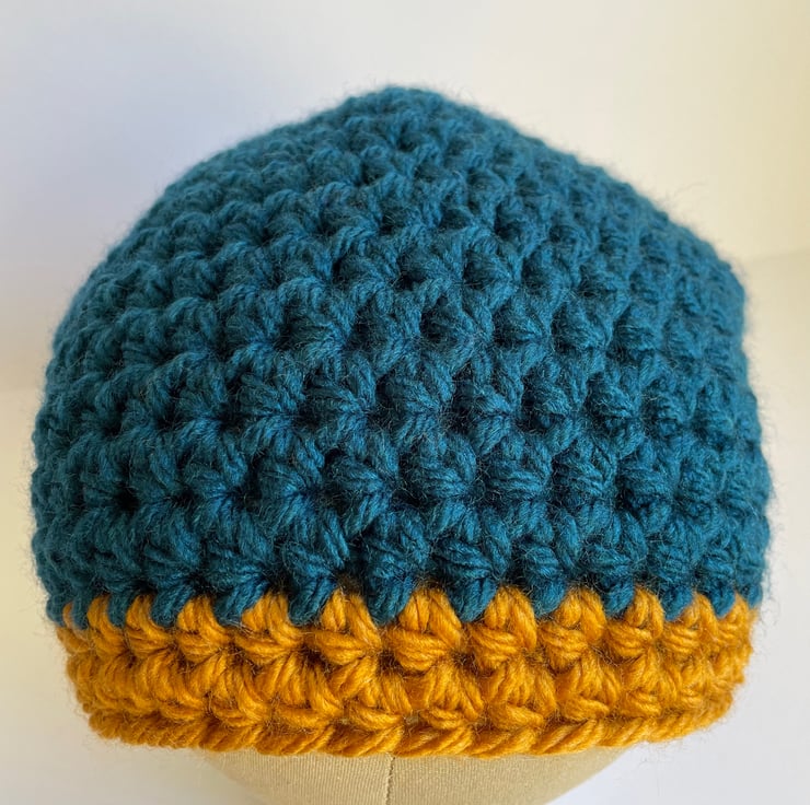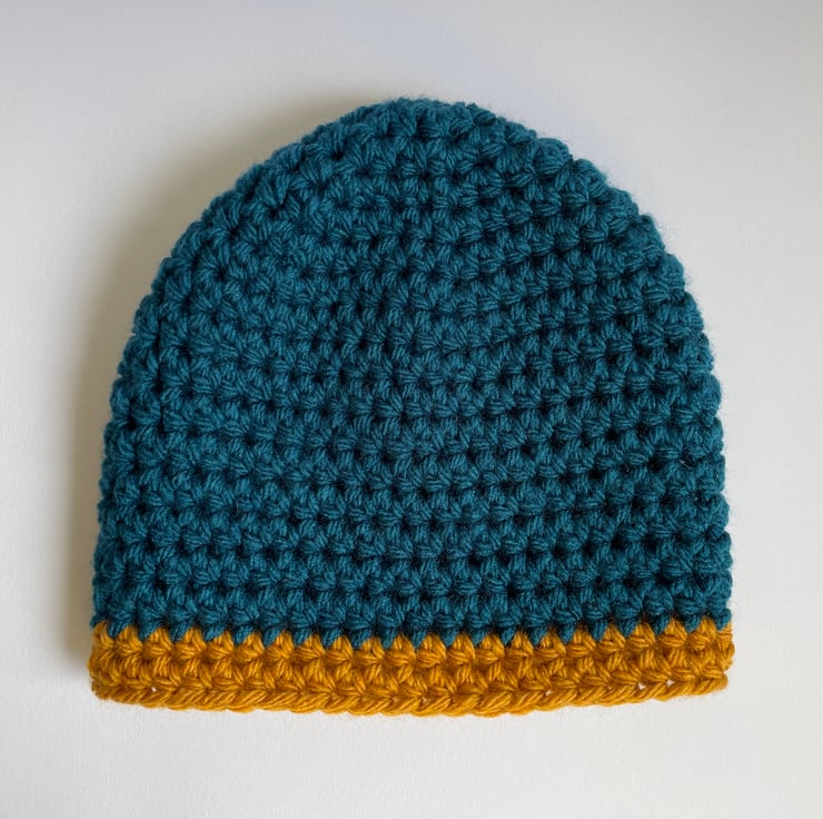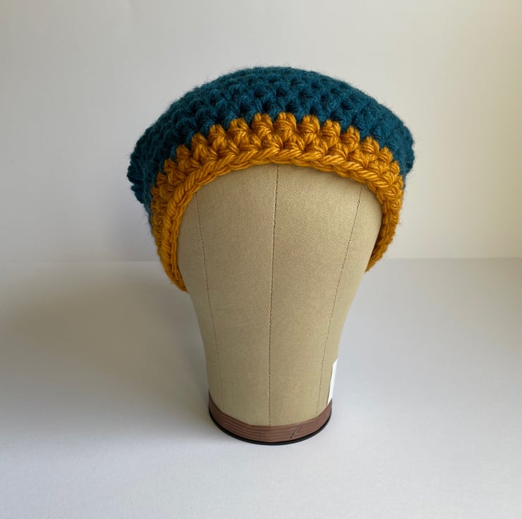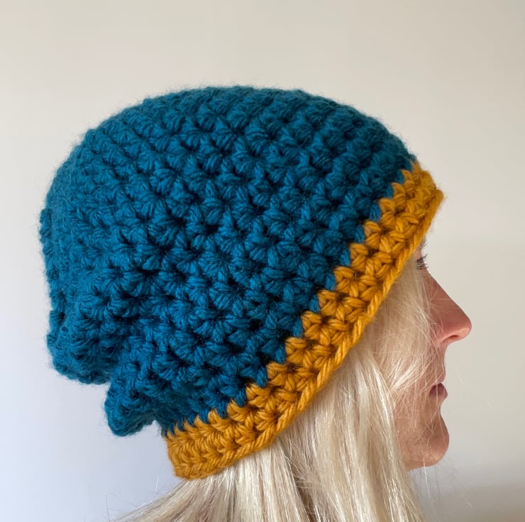 This is one slouchy hat for that laidback skater cool vibe. Made with super chunky King Cole acrylic yarn in the shades of Petrol Blue and Brass.