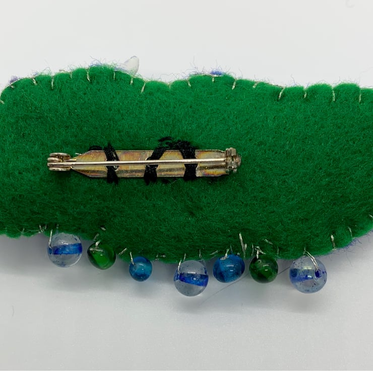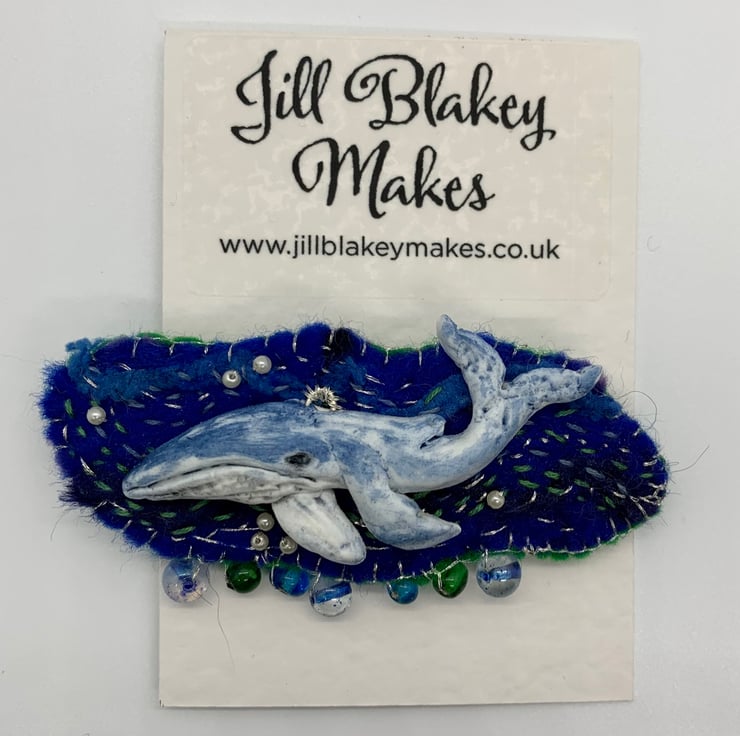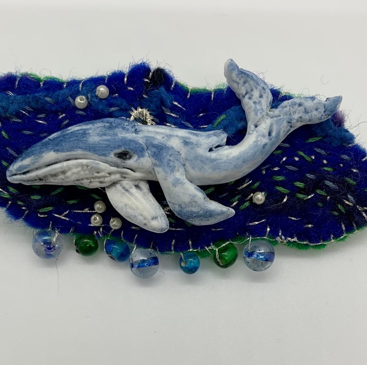 A humpback whale, hand-sculpted in polymer clay and stitched onto a wet felted, embroidered and embellished background.