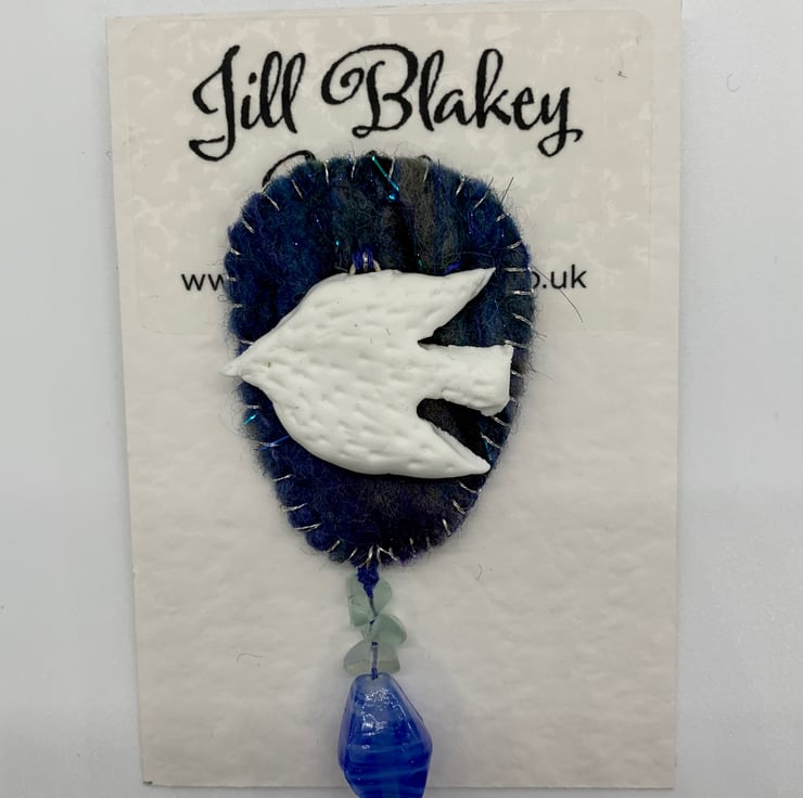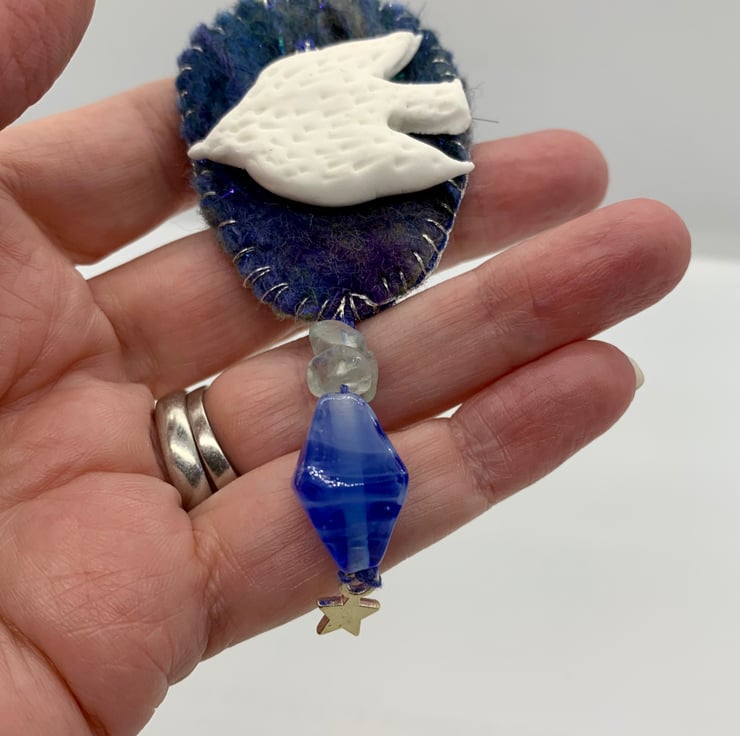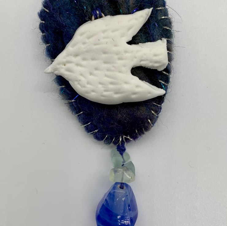 A white bird, hand-sculpted in polymer clay flies across a blue felt sky.