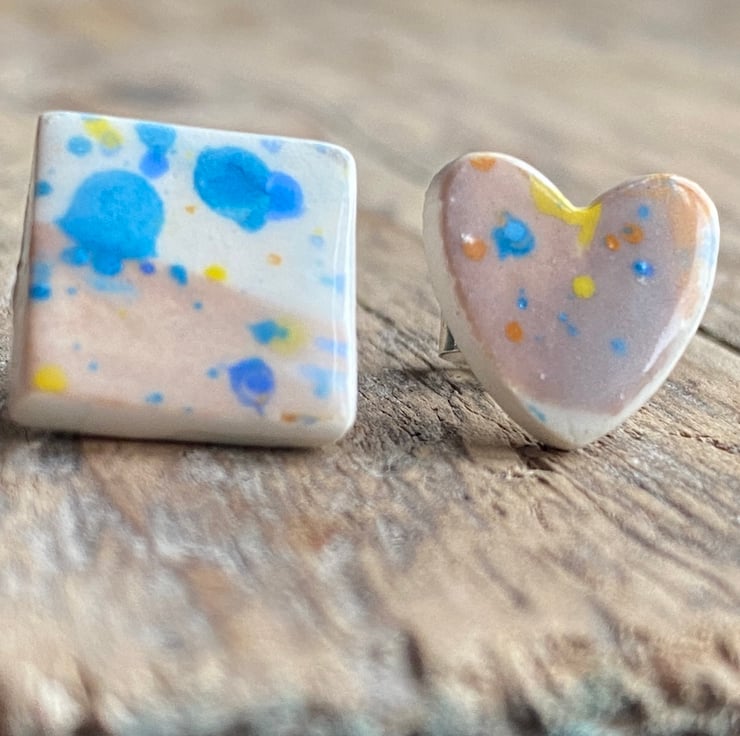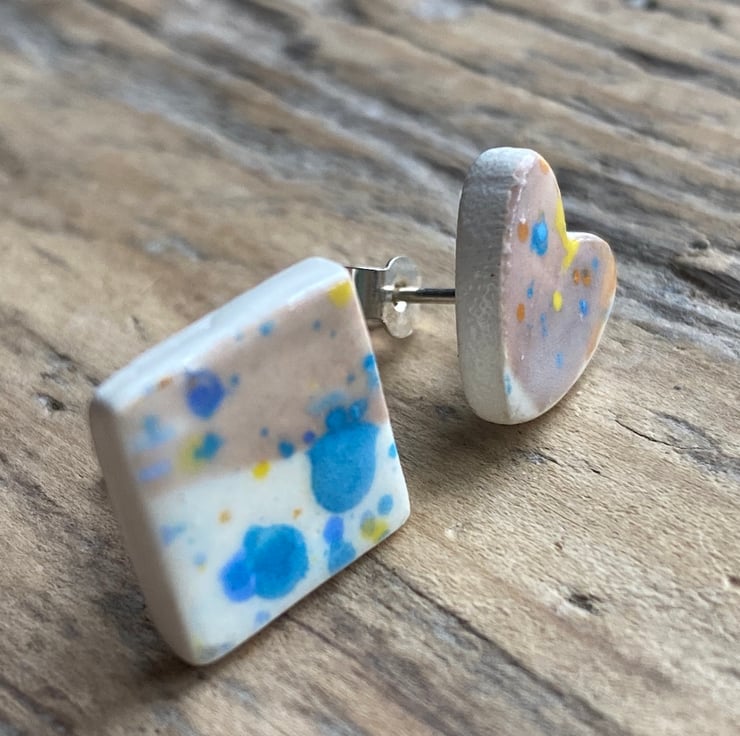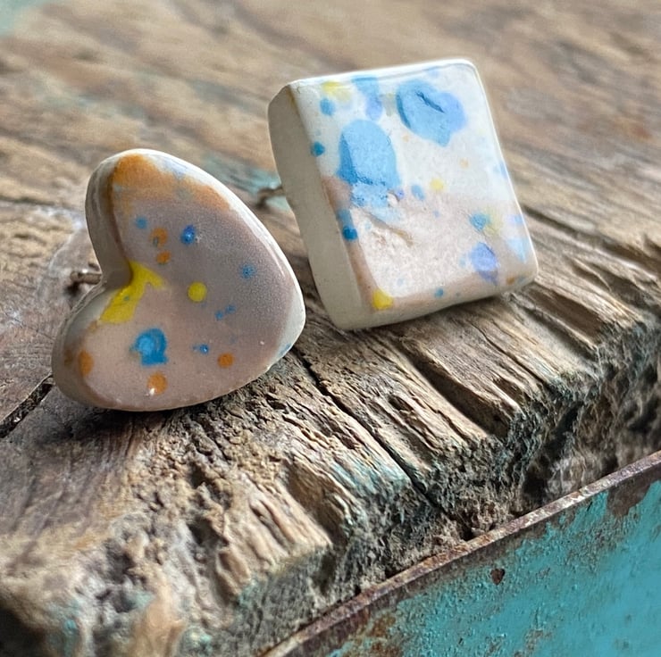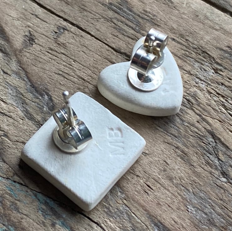Crafted from Earthenware clay, each Square and Heart stud is individually formed and hand-painted using a blend of ceramic slips and underglazes.