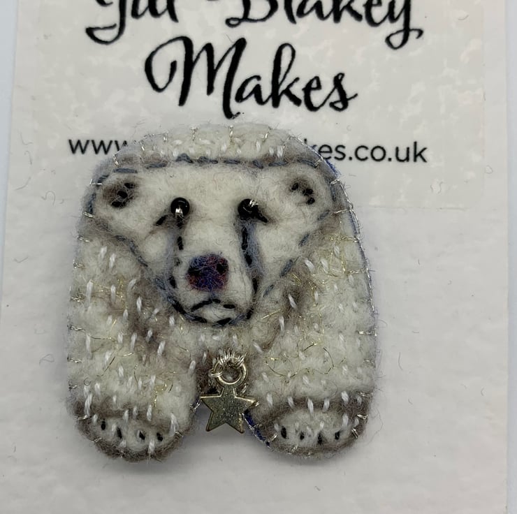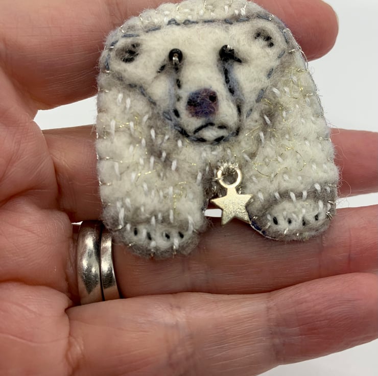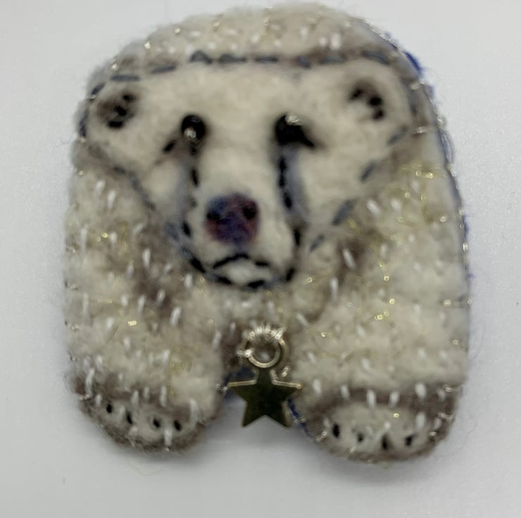 A wet felted and embroidered polar bear with a little silver star around his neck.