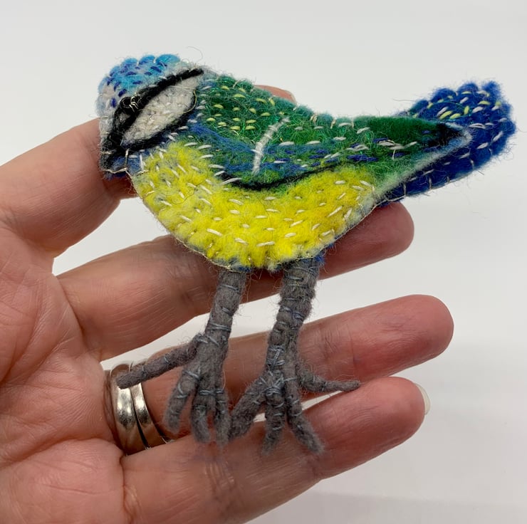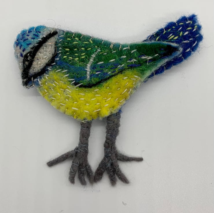 A wet felted and embroidered blue tit brooch with a tiny black bead eye.