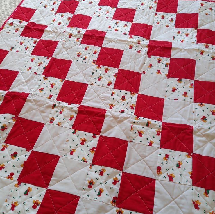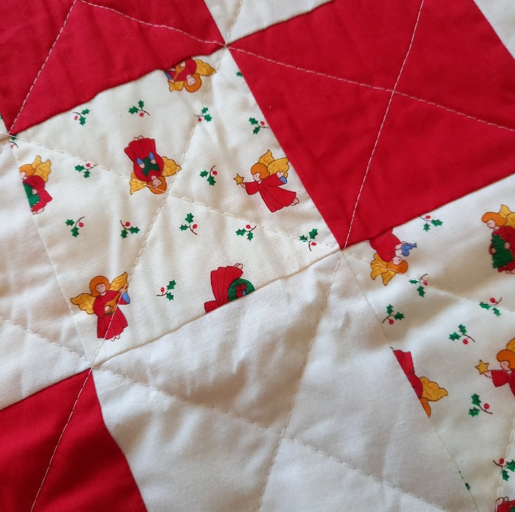 the patchwork also consists of plain red and plain cream squares, complimenting the colours in the angel fabric.