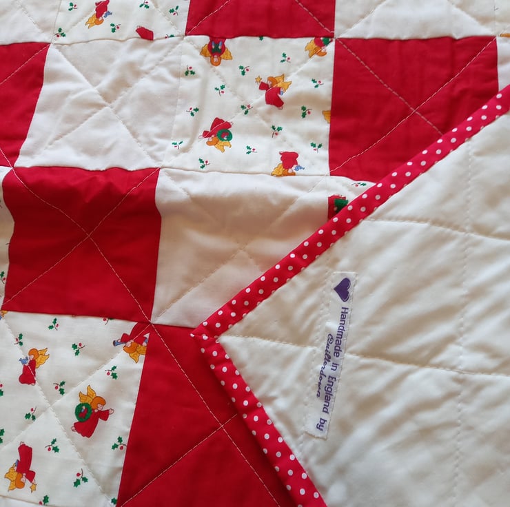 A pretty Baby quilt for Xmas, featuring a lovely vintage fabric which pictures angels and holly on a cream background.