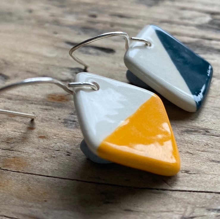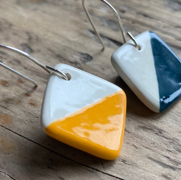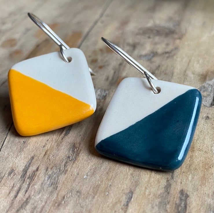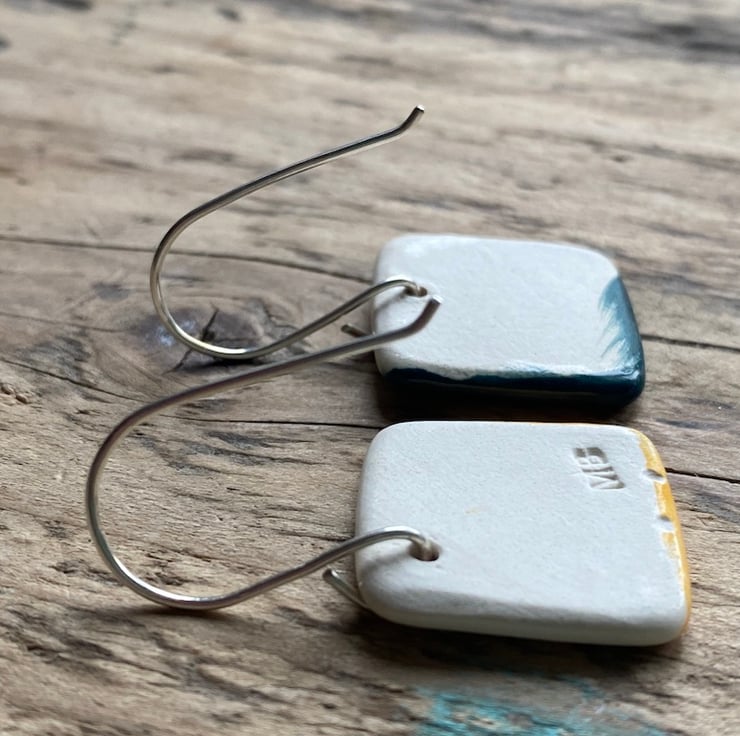 These Square earrings are hand formed using Earthenware Clay before being painted in underglaze of Teal and Orange. The earrings then receive 3 coats of transparent glossy glaze, leaving the rear unglazed so the natural quality of the clay can be appreciated.