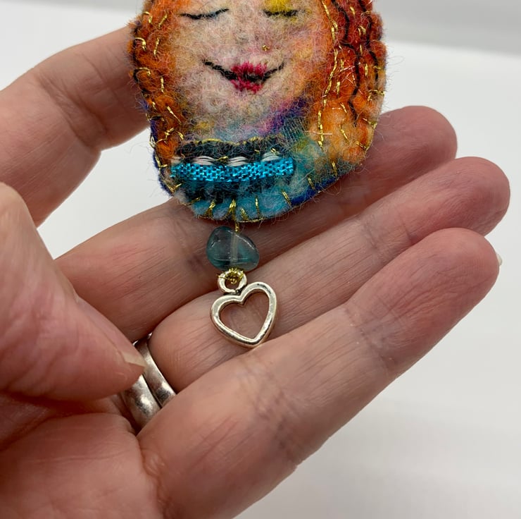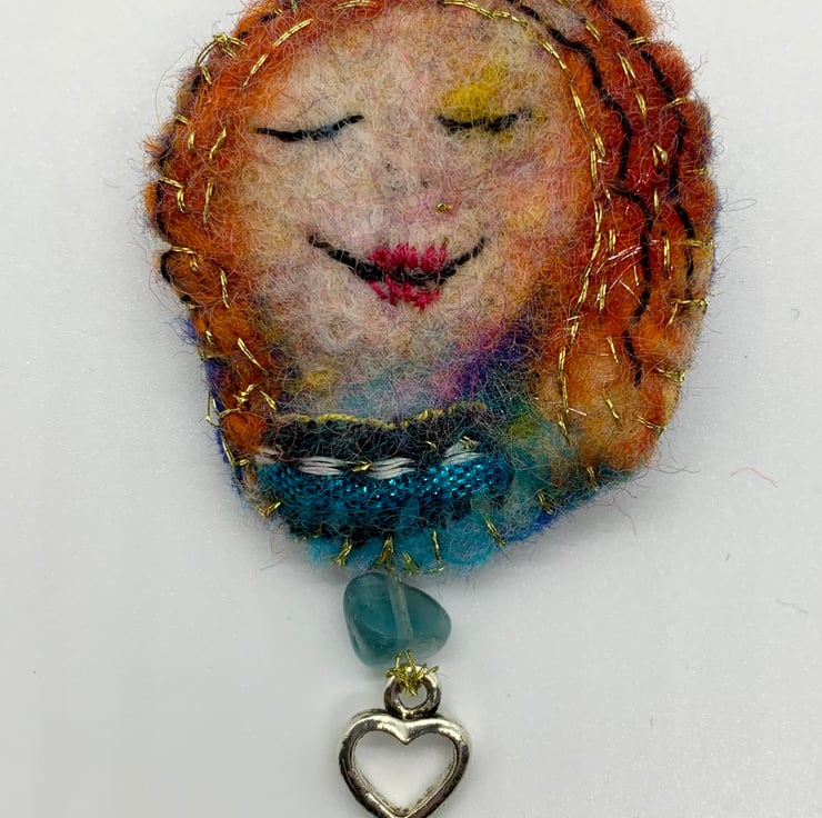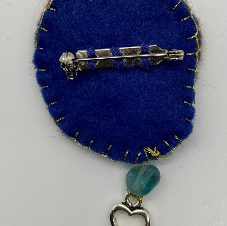 A hand felted and embroidered brooch, embellished with a crystal bead and a silver love heart.