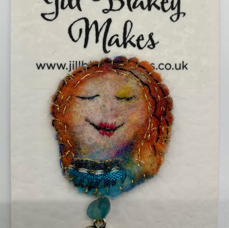 This happy angel smiles sweetly and has hand embroidered features on a wet felted background.