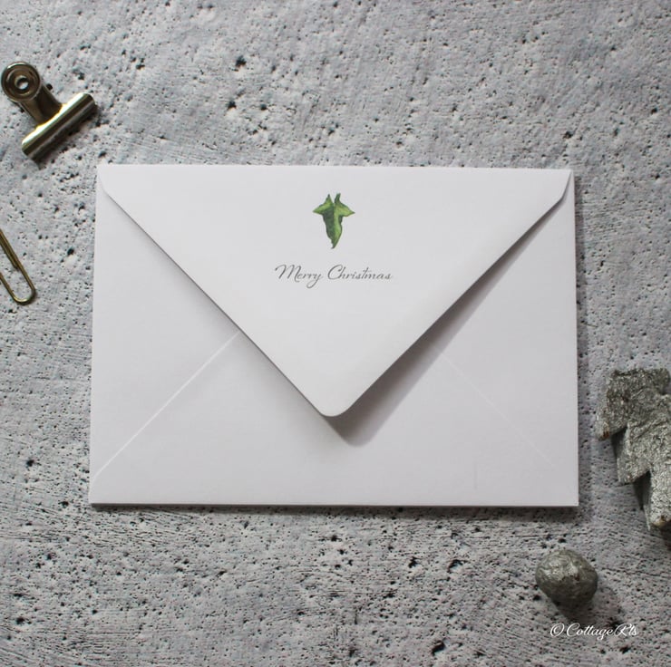 - 5 white C6 envelopes with an ivy design and 'Merry Christmas' printed on the envelope flap.