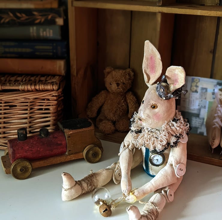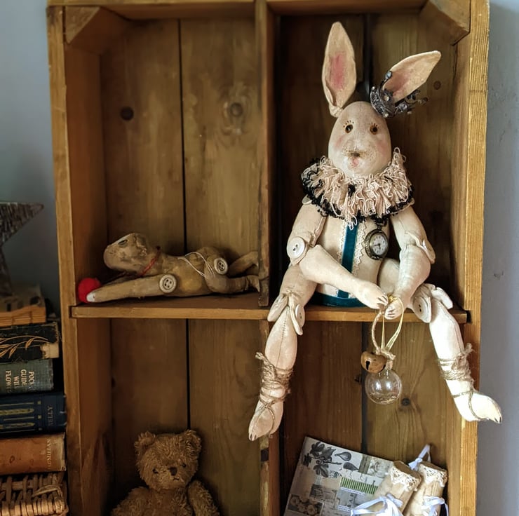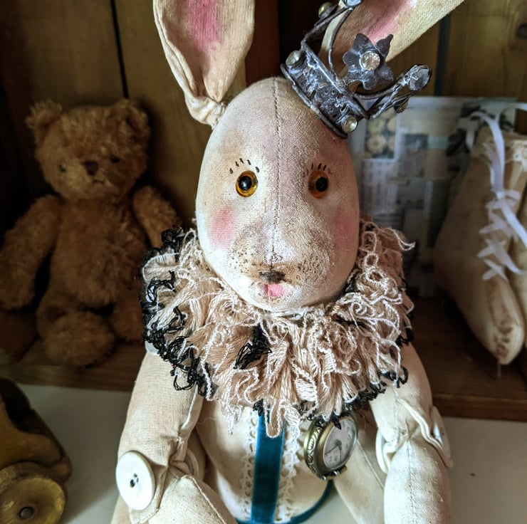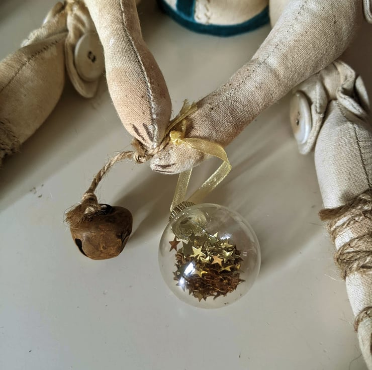 His Elizabethan style ruffle is darted with tiny sequins, pinned to his chest is wee pocket watch ( a broken preloved item found at a vintage market). He carries a magic bauble filled with star wishes and a rusty bell for summoning faery friends. On his head is a mini metal crown with jewel embellishments (for he is both majestical and magical).