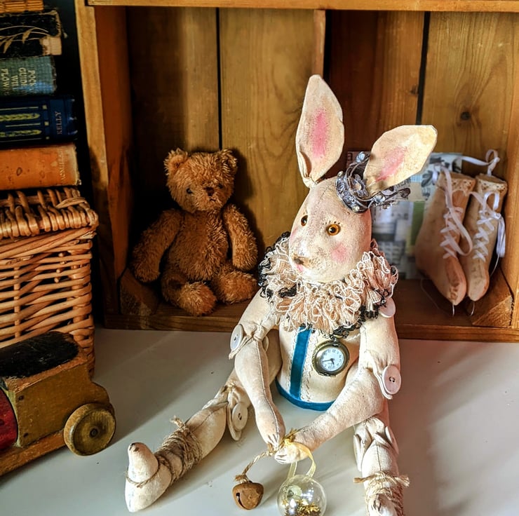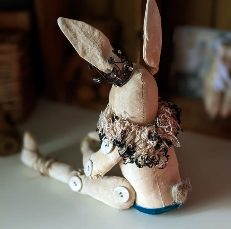 cream vintage lace with a teal velvet ribbon laid on top and around his flat bottomed edge. Each joint has a 1930s shirt button part of a collection of bits an bobs i have sourced over the years.