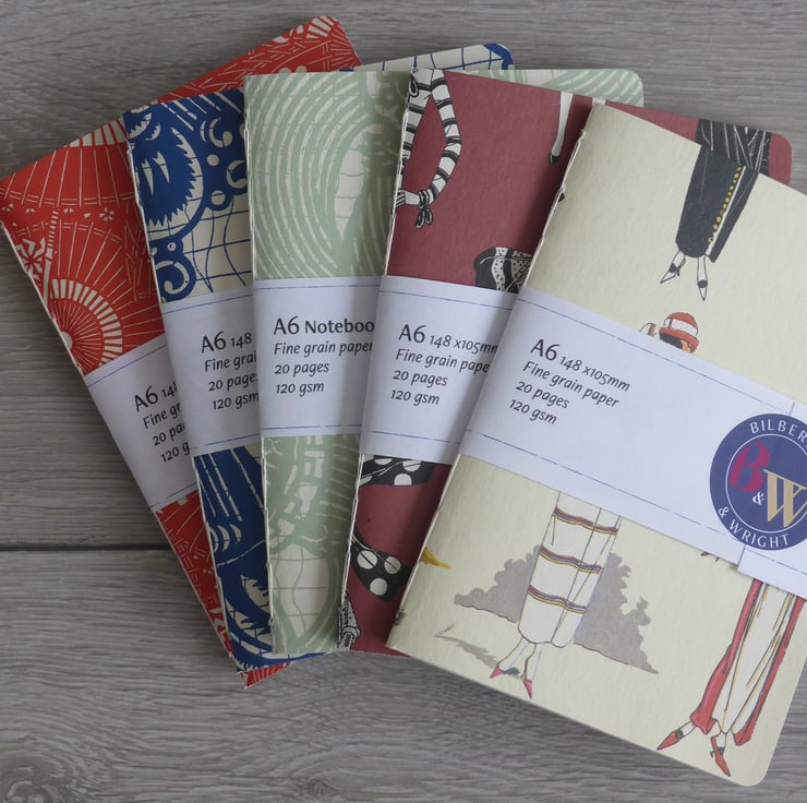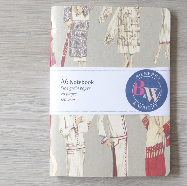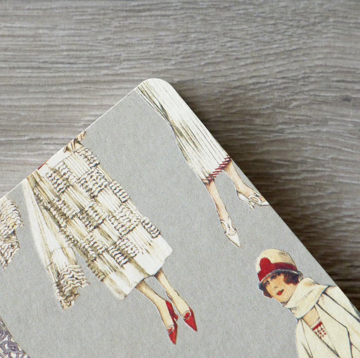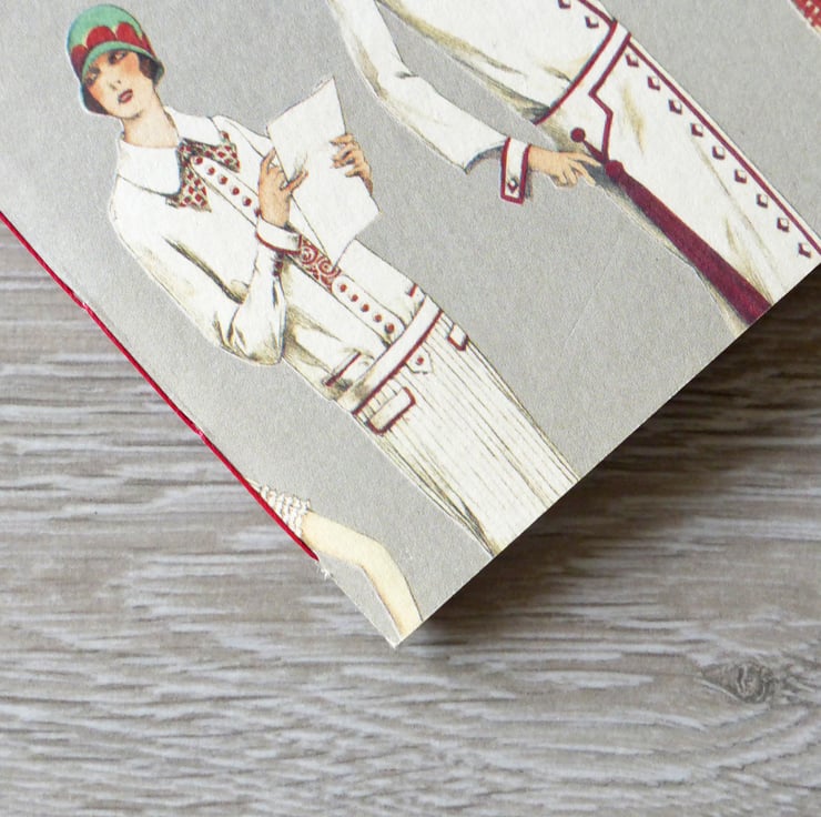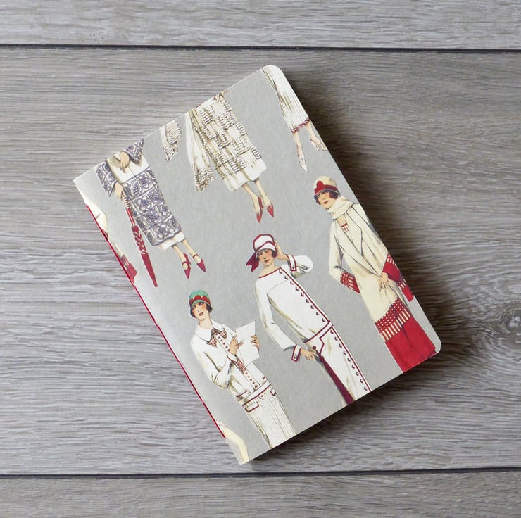 A handmade A6 notebook, with a cover of 1920s fashion, made up with fine grain acid-free paper cut to size and stitched together with a traditional handstitched chain stitch linen thread binding.
