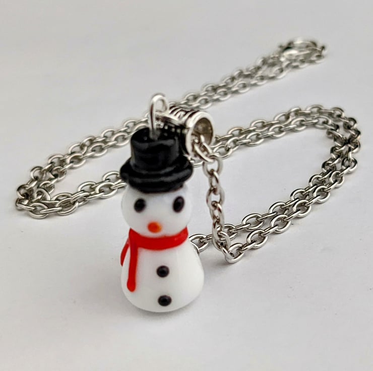 25mm glass snowman (with red scarf) with Tibetan silver bail on an 18" silver tone chain. In an organza gift bag.