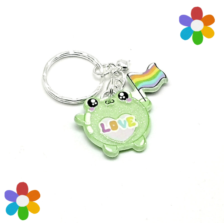A cute keyring featuring an acrylic frog charm holding a pride flag with a silver plated puffed heart.