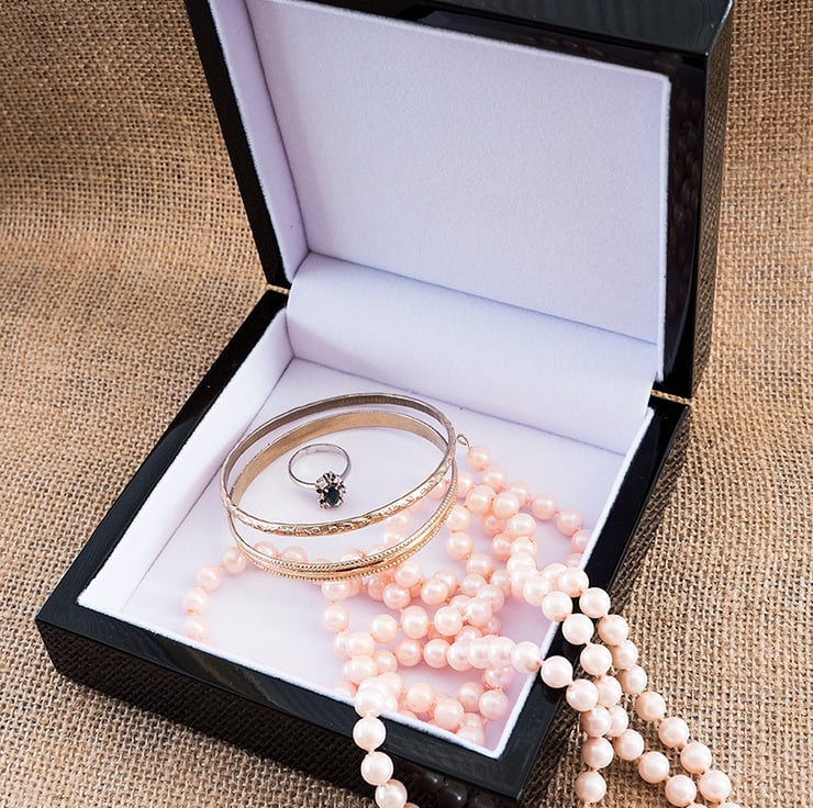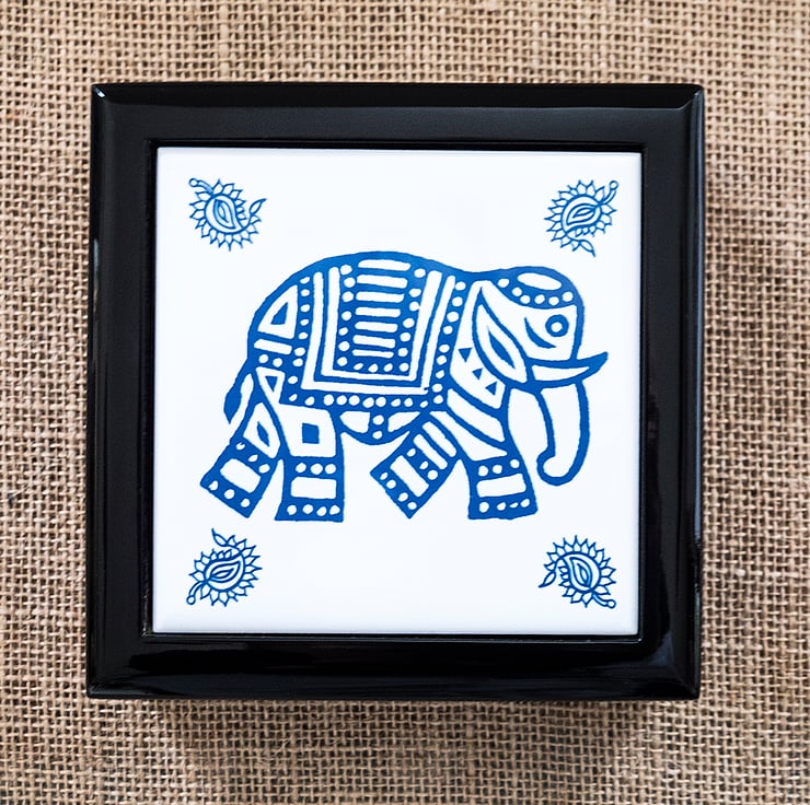 A beautiful high gloss black jewellery/keepsake box with a luxury white flock lining and lovely Indian elephant motif on the ceramic tile lid. The design was inspired by Indian wood block printing. The elephant is blue and there is a blue paisley motif in each corner.