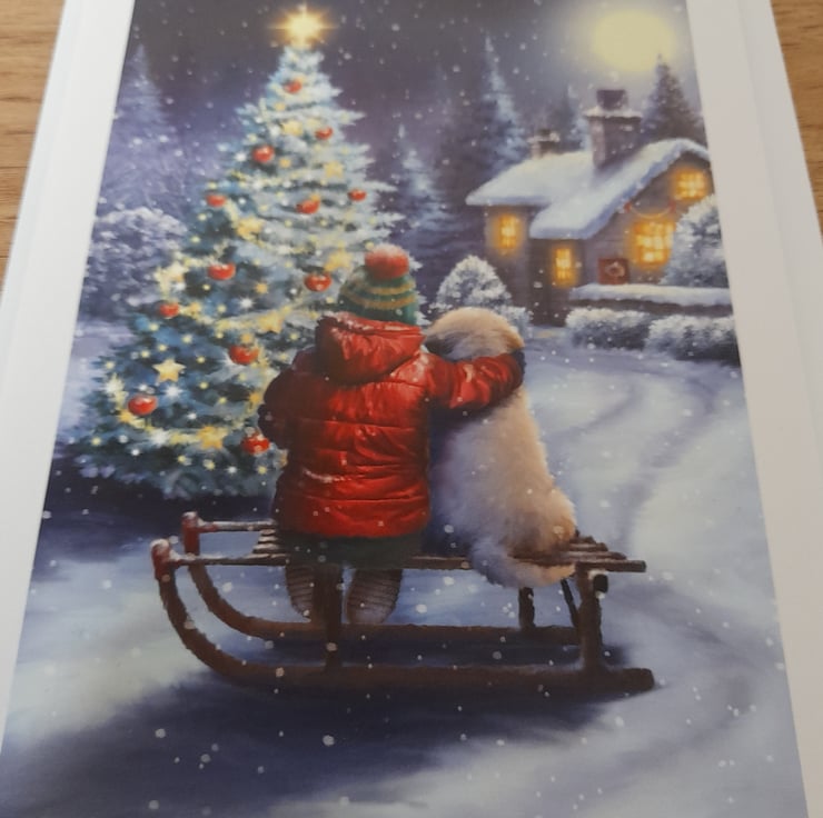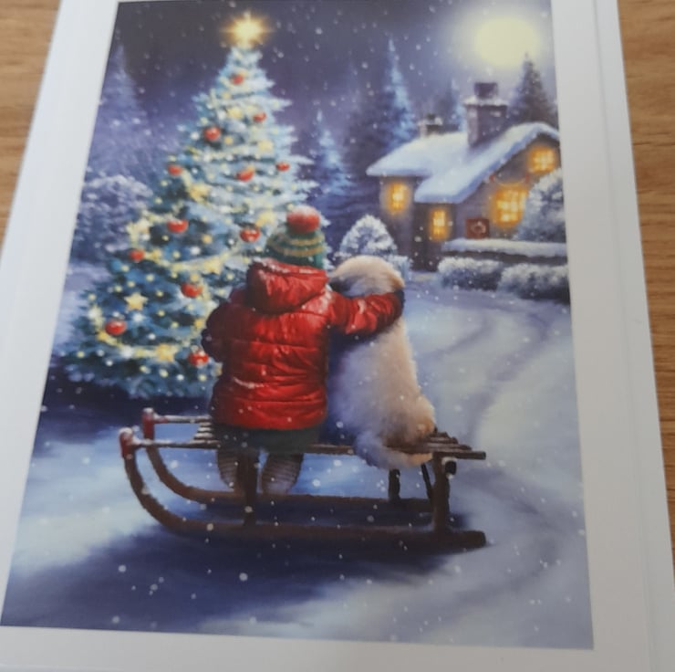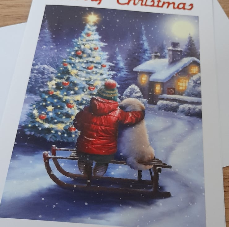 DESIGNED AND HANDMADE CUTE CHRISTMAS CARD WITH A CHILD AND DOG CUDDLED UP LOOKING AT A CHRISTMAS TREE, IN A CHRISTMAS SCENE.