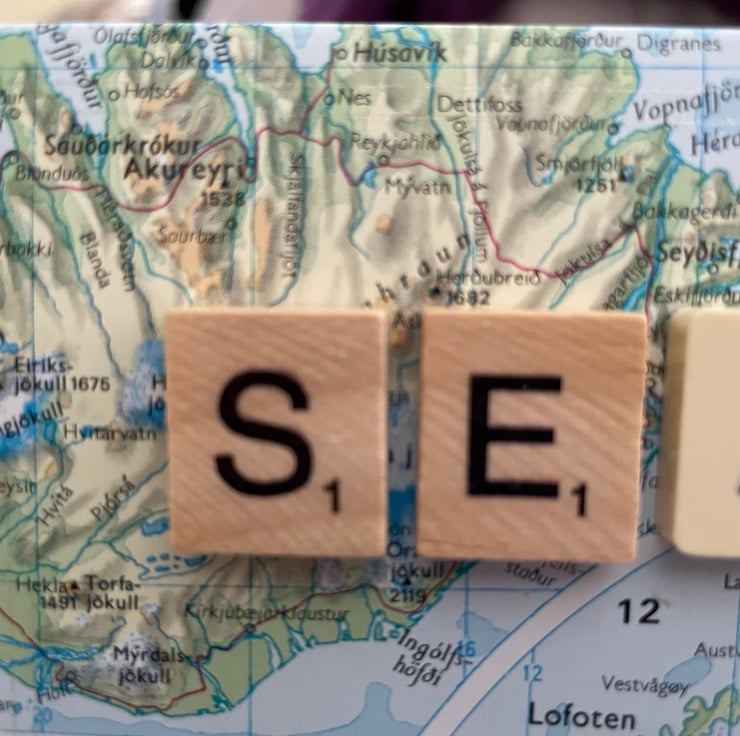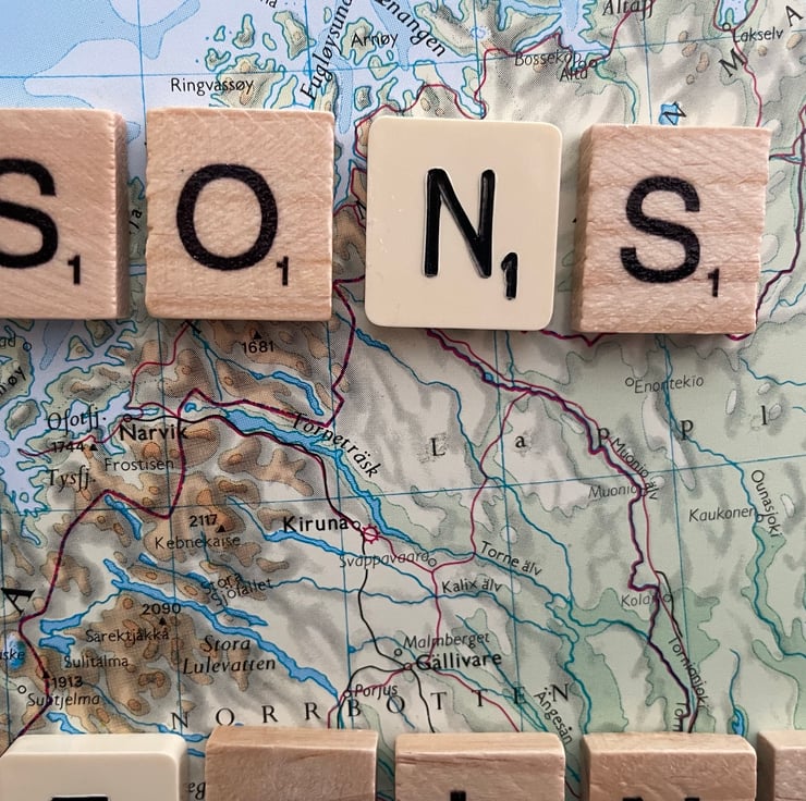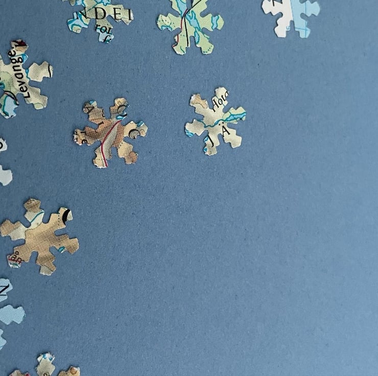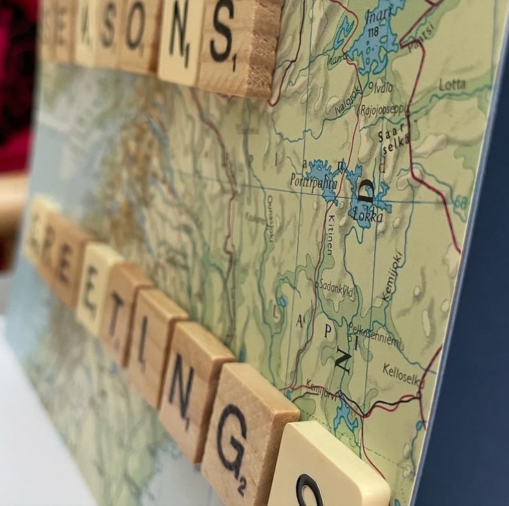 Santa's home, beautiful Lapland is the feature of this unusual christmas card. This A5 sized card features a map of Lapland, Santa's home. It is from an atlas and shows all the detail of mountains and fjords, towns and cities,rivers and lakes. The main greeting is in scrabble letters, some wooden and some plastic from a genuine scrabble game. The map is accentuated with a soft silver glitter pen. Inside the card has a scattering of snowflakes punched fron the same map page.
