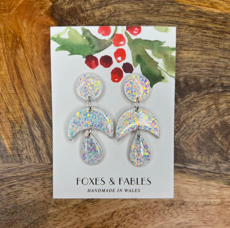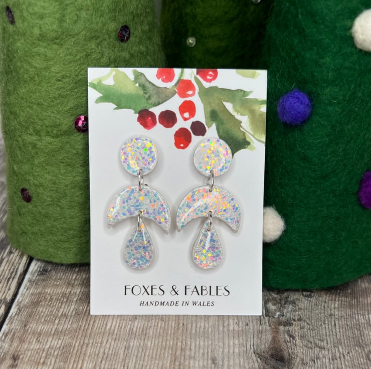 Handmade chandelier style earrings made from polymer clay with chunky glitter and resin. So shiny, designed with Christmas parties in mind but perfect for any occasion you want a bit of sparkle. Made with pearlescent polymer clay topped with iridescent chunky glitter and resin.