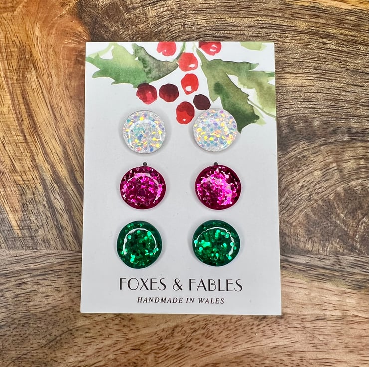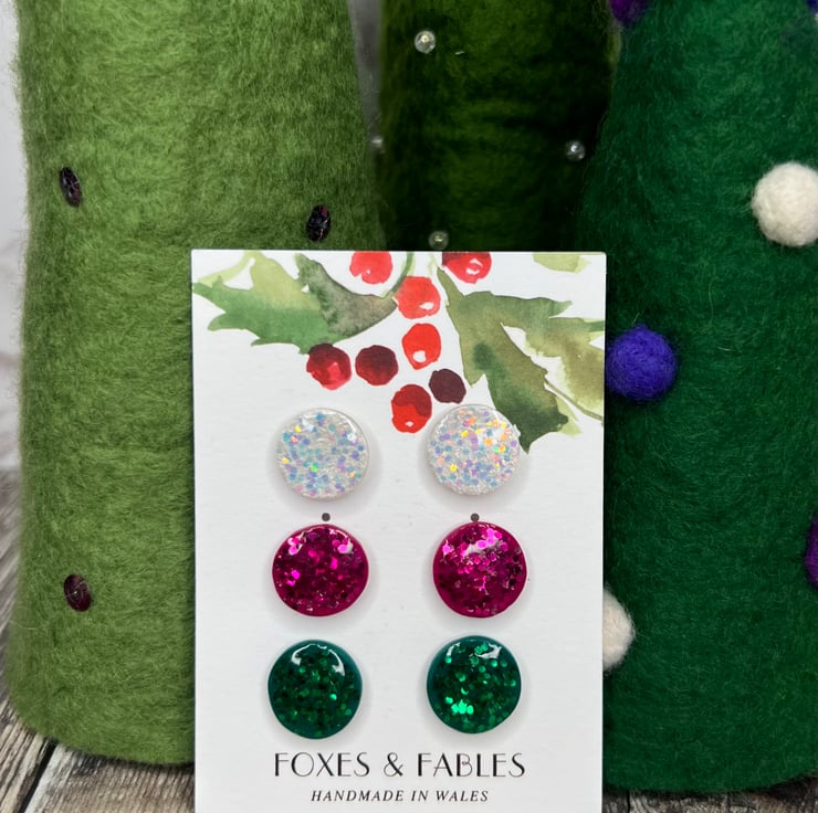Set of 3 stud earrings handmade from polymer clay and resin. Sparkly bauble earrings in 3 different colours made using chunky glitter.