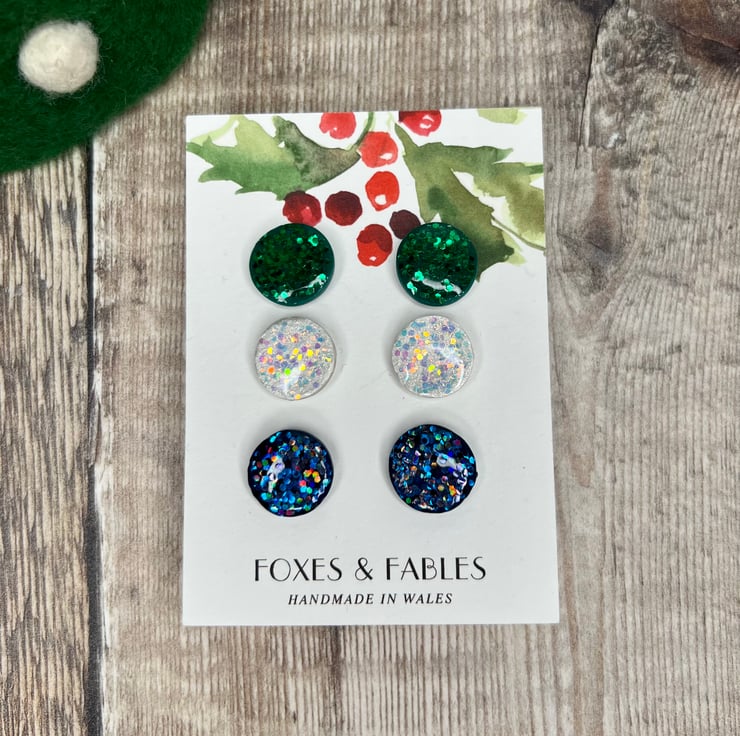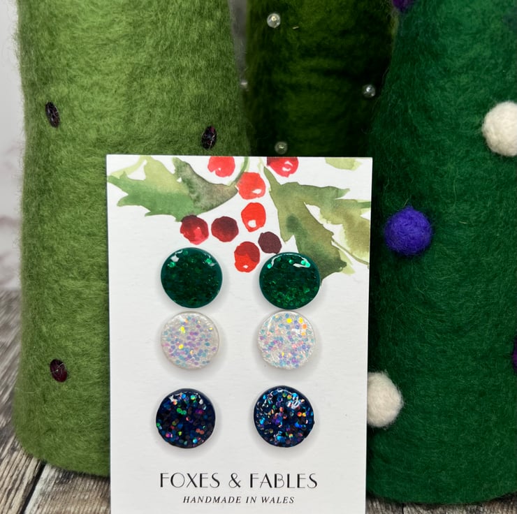 Handmade polymer clay stud earrings. Set of 3 sparkly earrings in pink, green and pearl. Made with chunky glitter and resin for a sparkly high shine finish.