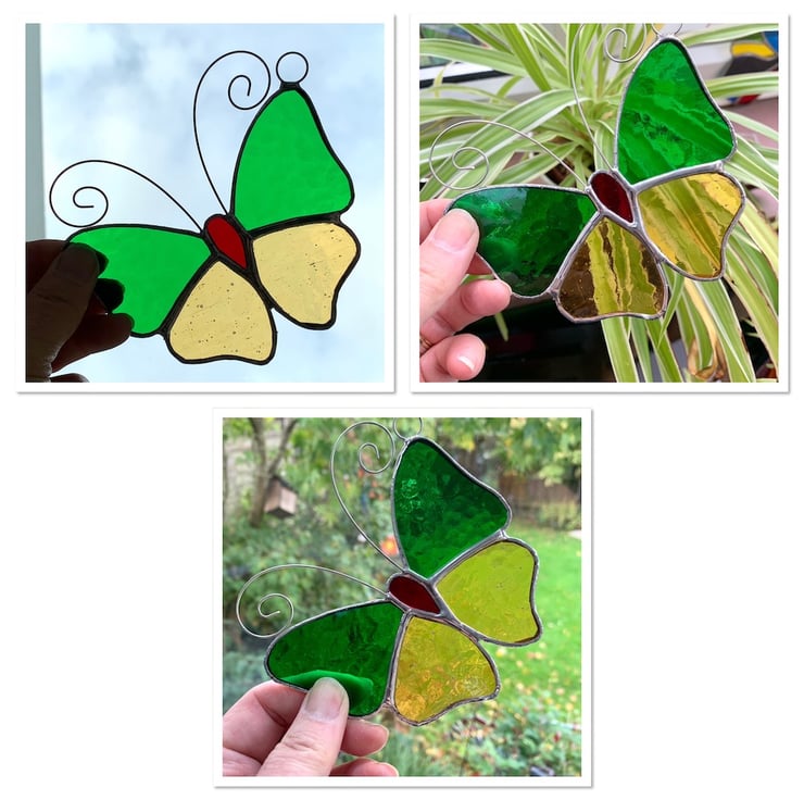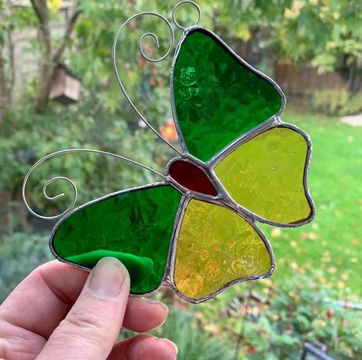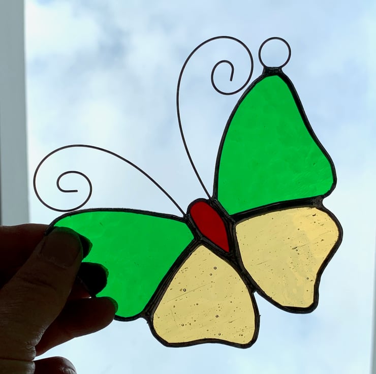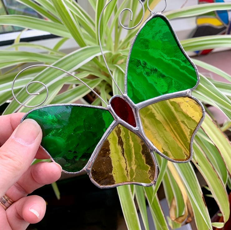 This stained glass butterfly has been made from green corella glass and amber texture glass for the wings and red corella glass for the body.