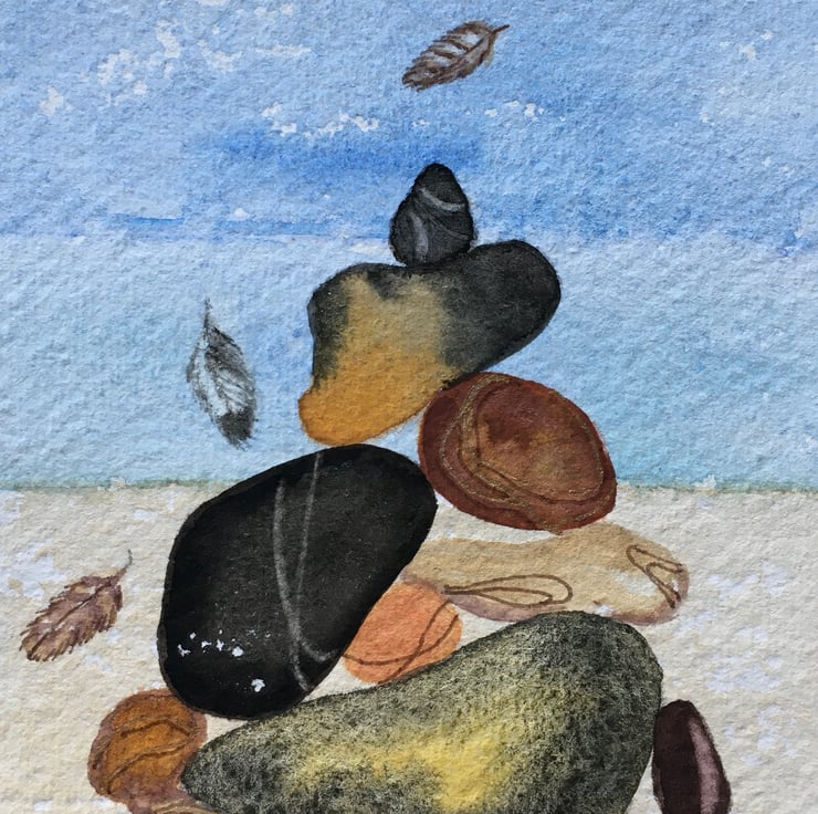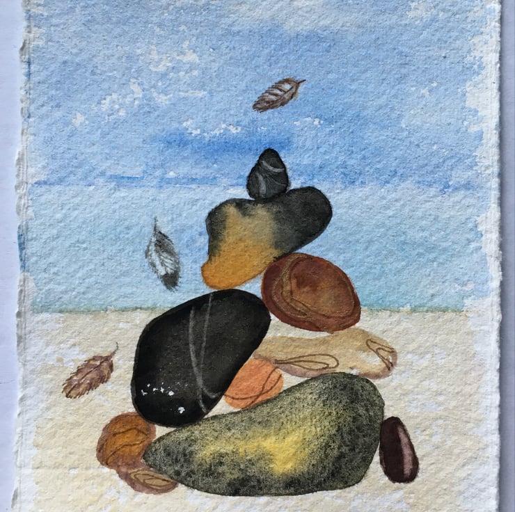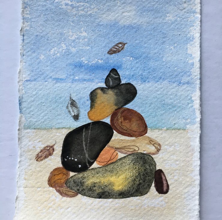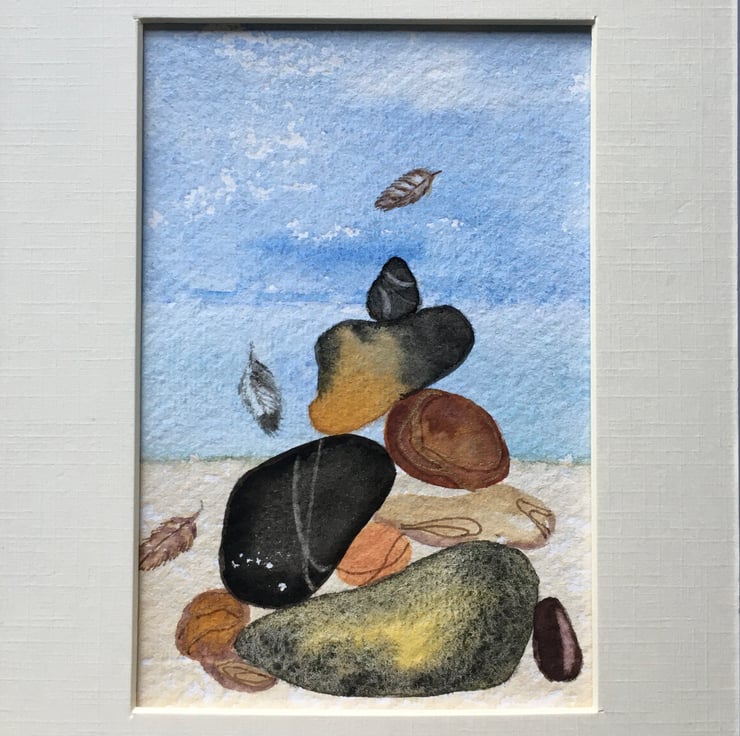 This hand painted small artwork showing pebbles and feathers, uses Artist quality materials. Measuring approx 15cm x 10cm, it is on hand made watercolour paper. It will be sent with a mount in a cello bag within a sturdy envelope. Postage is free to UK destinations.