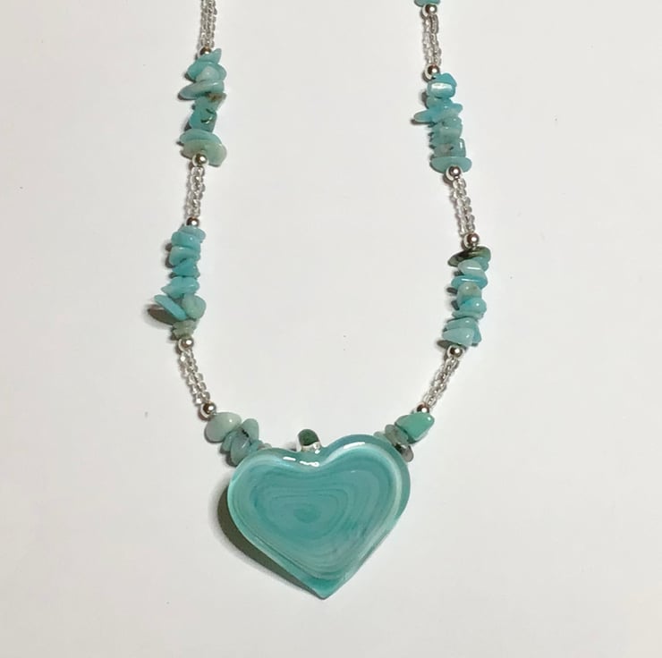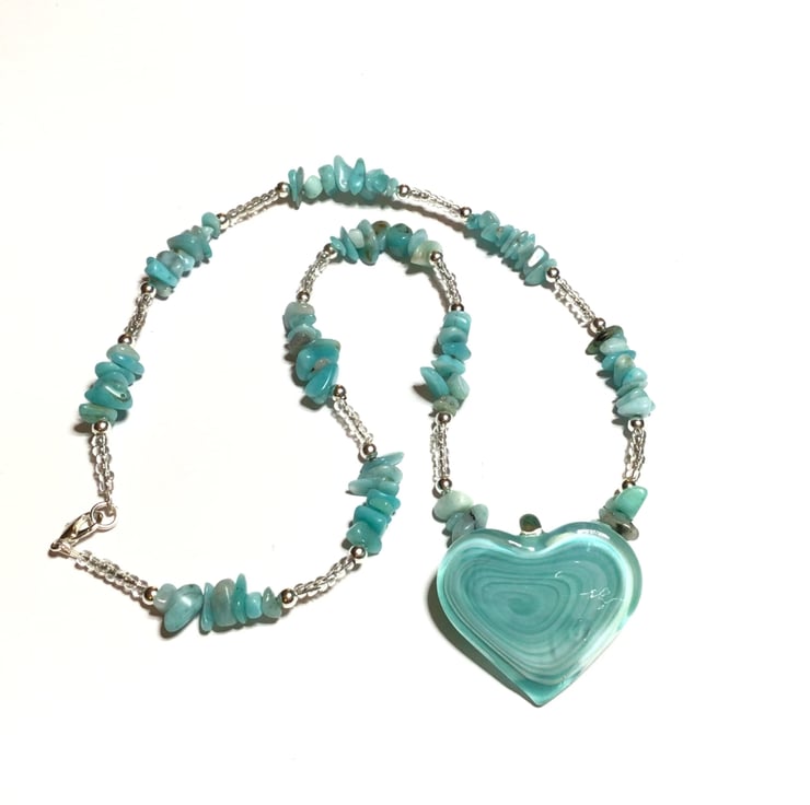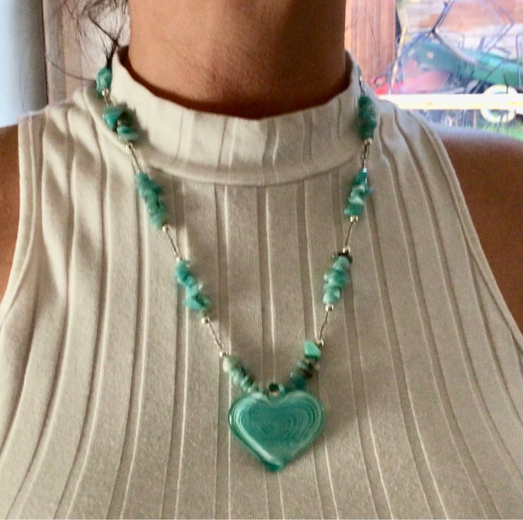 This recycled, remade and reloved necklace is made from broken and unwanted costume jewellery which I have taken apart and remade into a unique item. The beautiful turquoise coloured genuine amazonite chips are mixed with small clear crystal and silver coloured beads and the large glass heart makes this a beautiful statement necklace. It is 22inches long and the heart measures 1.5 inches wide. Amazonite is said to soothe the mind and helps with communication and calmness.