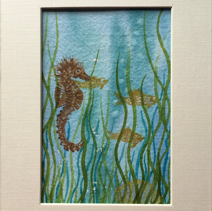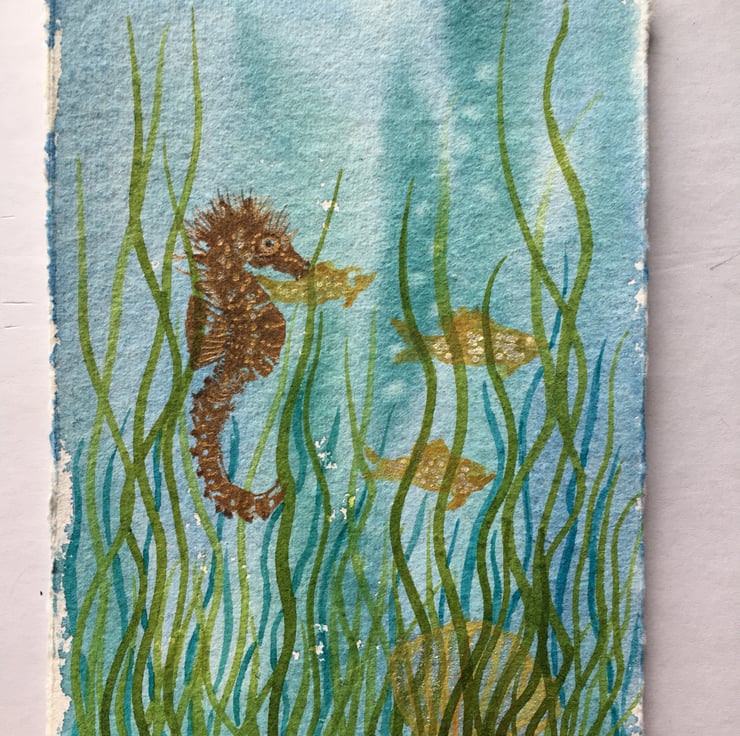 This small artwork measures approx 15 cm x 10 cm and is painted, using Artist quality materials, on hand made watercolour paper. It is a mix of watercolour and acrylic hand printing. It will be sent with a mount in a cello bag within a sturdy envelope. Postage is free to UK destinations.