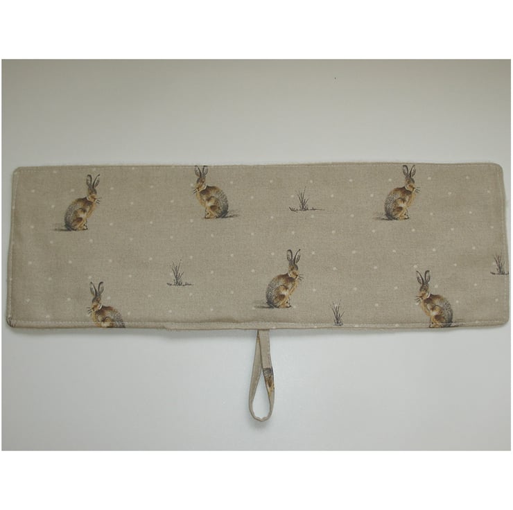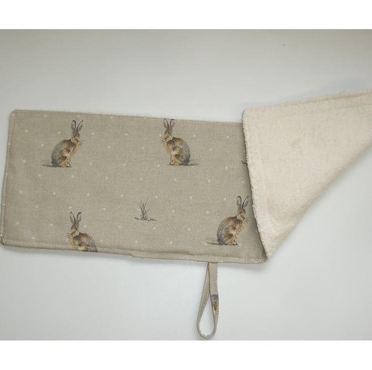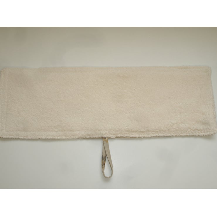 This mat has a handy fastening loop which keeps it in place when you lift the hob cover and has three layers - Facing cotton fabric, a layer of padding and a layer of towelling - Making it also suitable for mopping up and pot-grabbing!