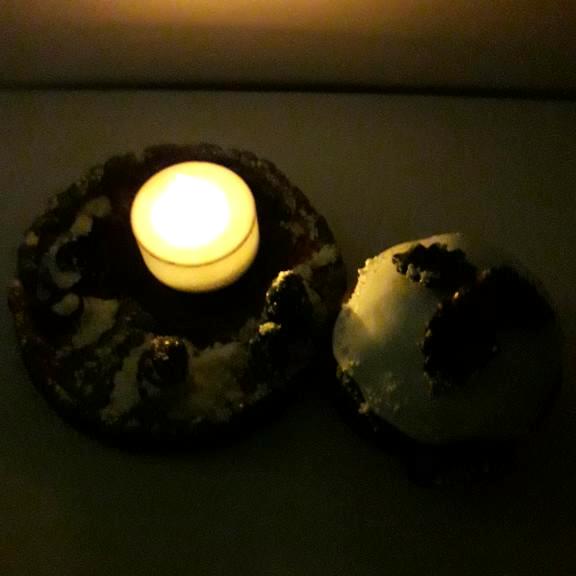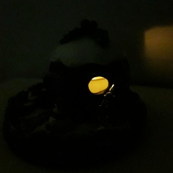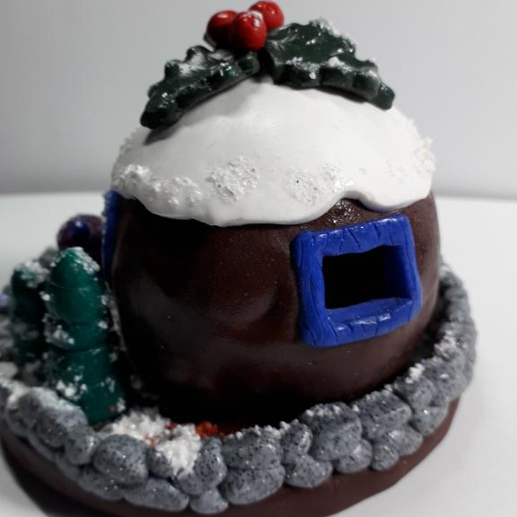 A Christmas pudding fairy house made from polymer clay which holds a BATTERY tealight inside, the house lifts off to reveal a platform to sit the tealight on.