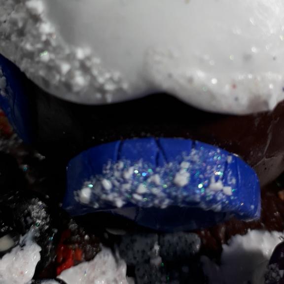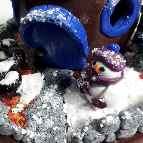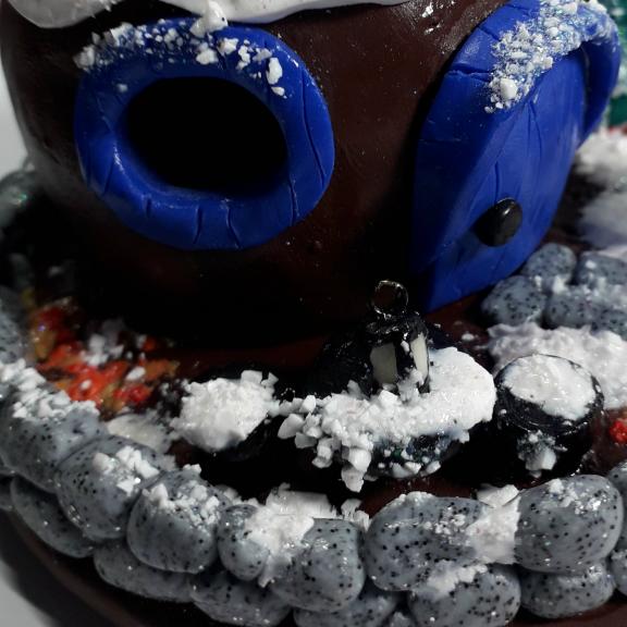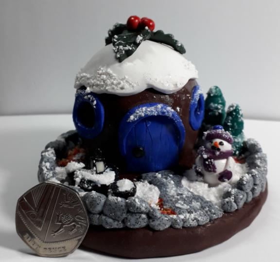 The door and window frames are in royal blue clay, I have added holly leaves and berries to the roof.