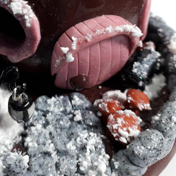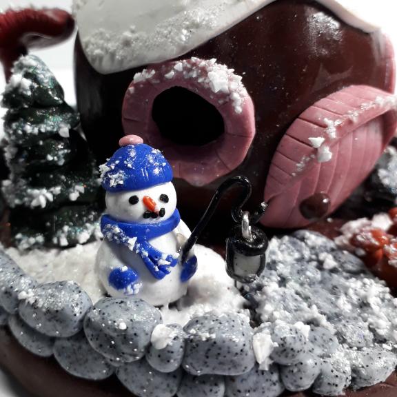 There is a stone wall all around the garden and a stone path from the door, I have added holly leaves and berries to the roof, there is a scattering of glittery snow all around.