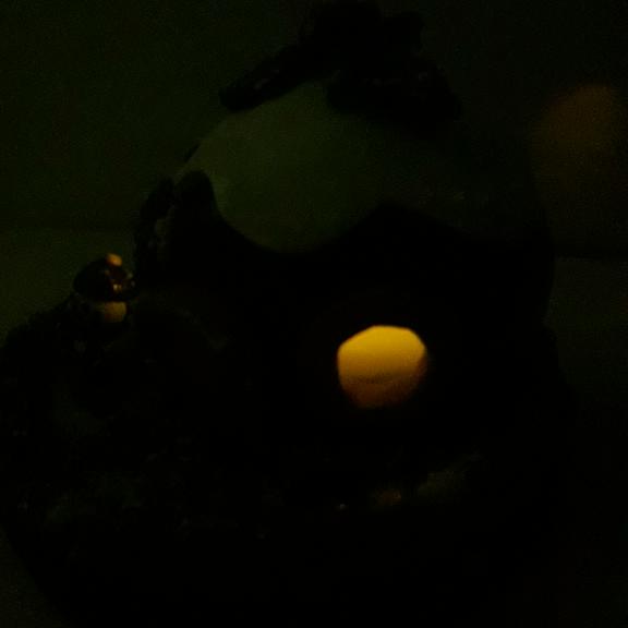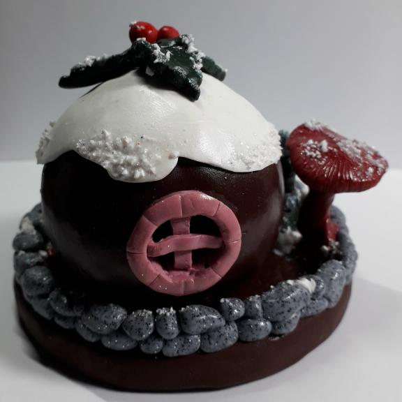 A fairy house in the shape of a Christmas pudding, it is approximately 9cm tall including the base, which is 10cm in diameter.