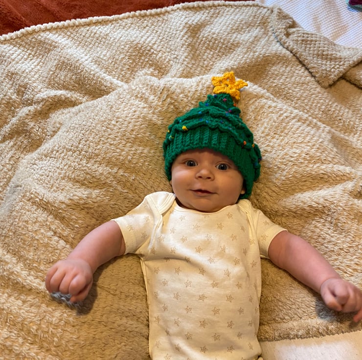 Unique one of a kind hand crocheted Christmas tree hat and knitted booties. To fit approx 2-6 months- baby shown is a large 10 weeks old and the hat is loose for a comfortable fit. Ideal for photo prop for Christmas cards etc.