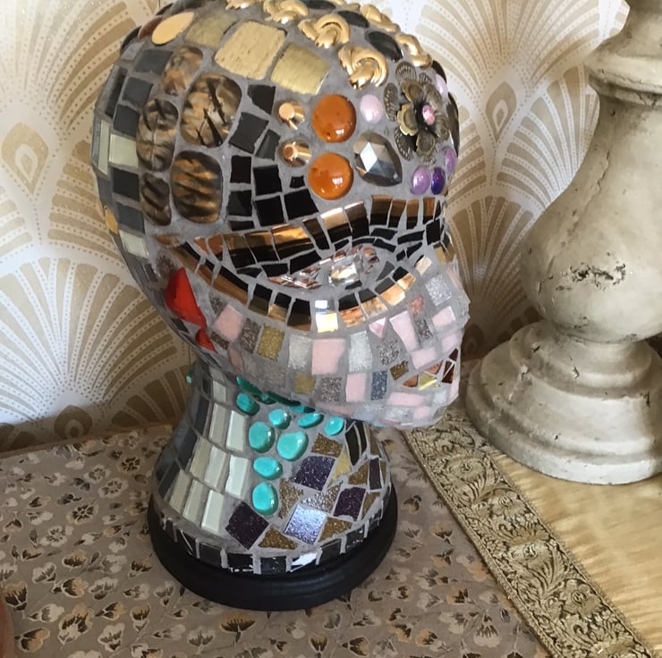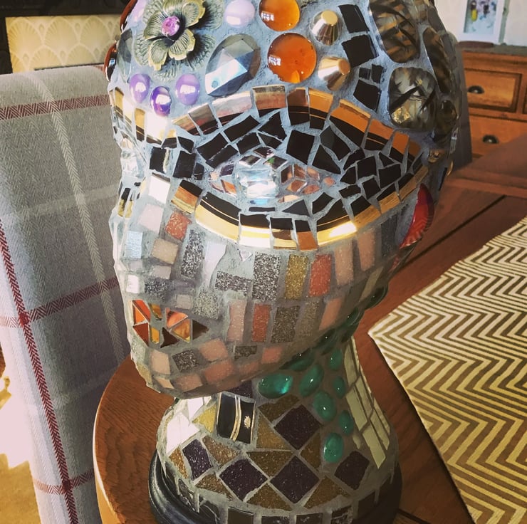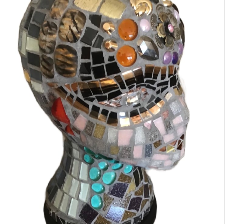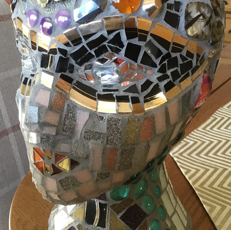 Lovely mosaic head, in bronze and gold theme, looks fantastic on a shelf or sideboard. Would be an interesting conversation piece ! Very unusual gift . Has a mahogany plinth,that has been felted beneath for protection. The materials used are glass, ceramic, jewellery,and waterproof grout.