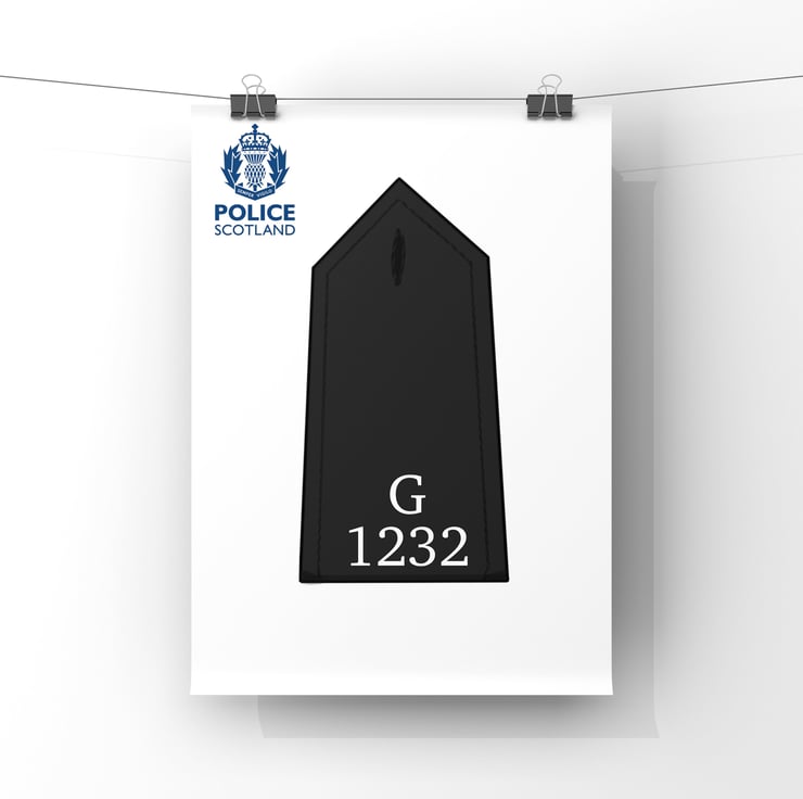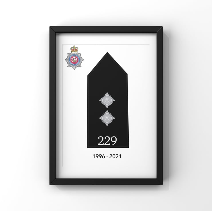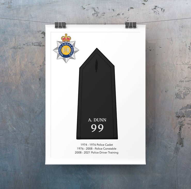 Upon ordering please send us a message with which print option you would like. The options can be seen in the photos. Any combination (epaulette, name, force logo and service dates) can be catered for. We also require the police number and the police force they serviced in.