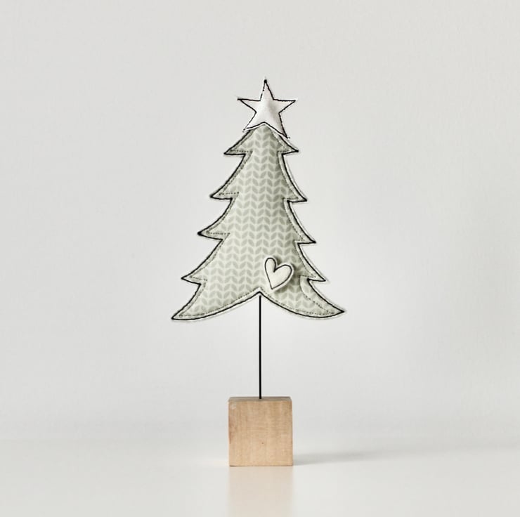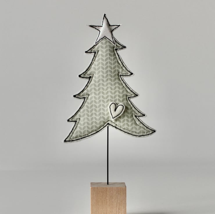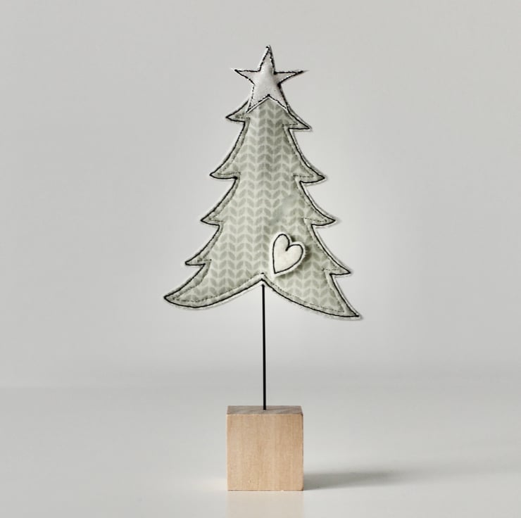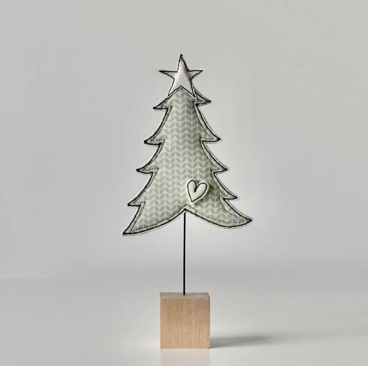 A little tree, with a glitter star, tiny heart, wire stem and wooden cube stand.