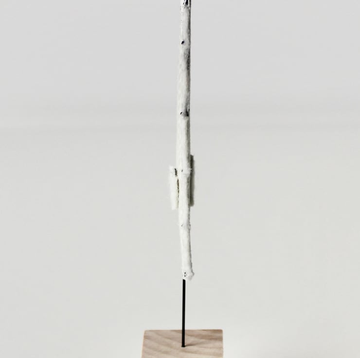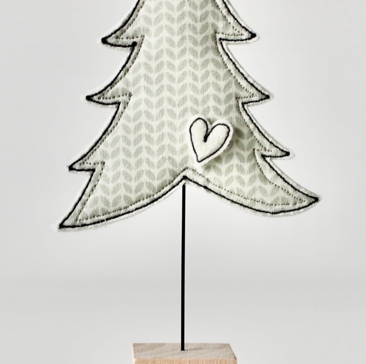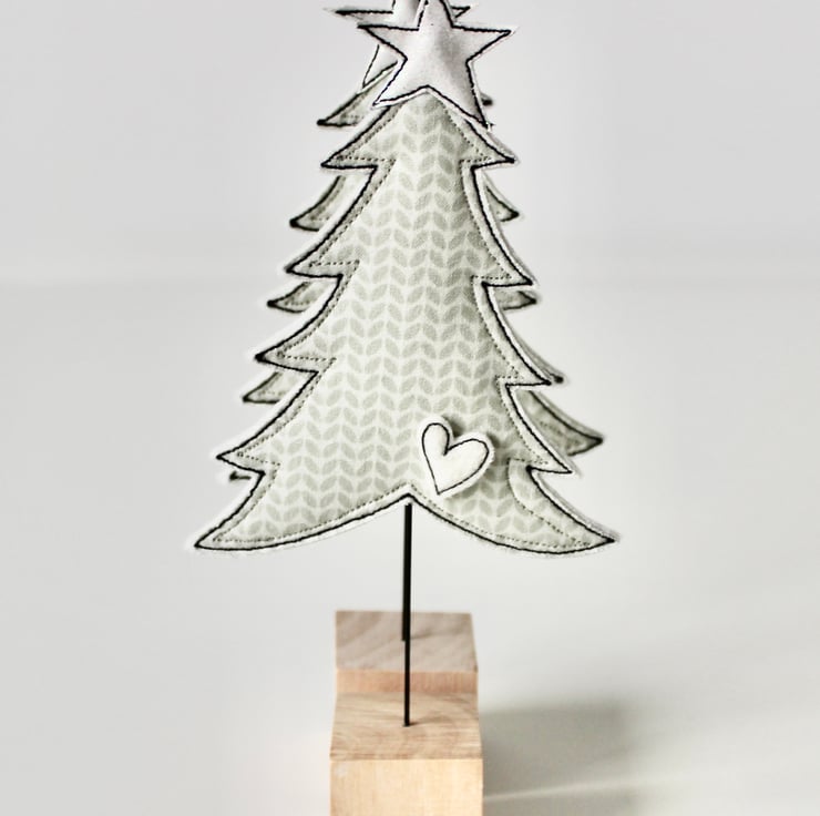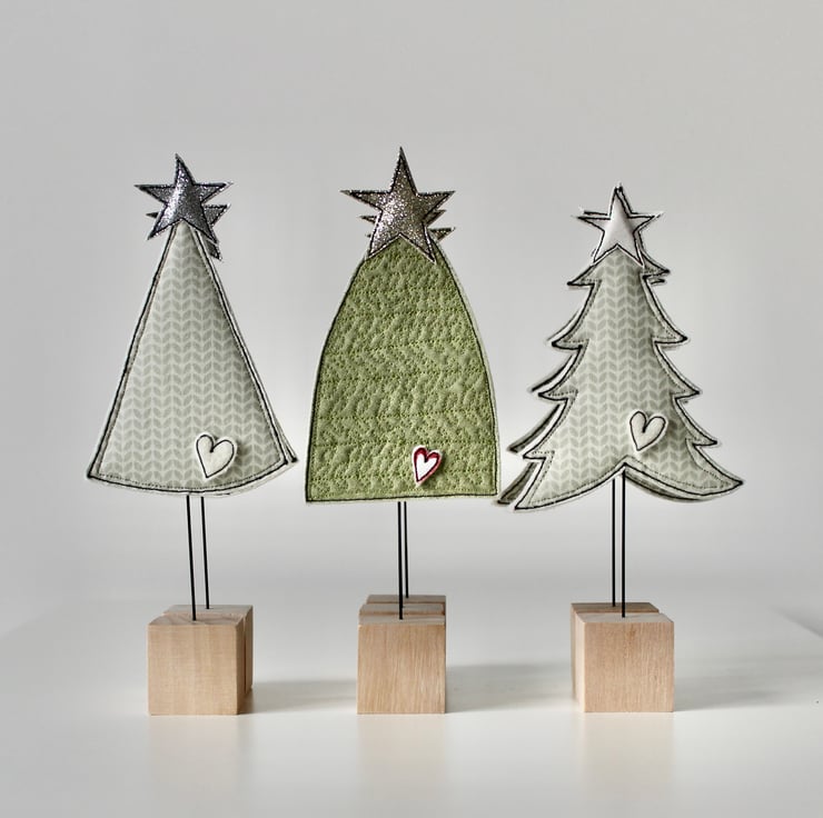 Little trees are created using free hand machine embroidery, cotton fabric, glitter cloth, 100% wool felt and a sanded wooden cube off cut.
