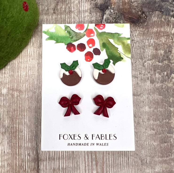 Handmade Christmas stud set consisting of Christmas puddings and festive red bows. Cute stud set perfect stocking filler. Both studs have silver plated posts and they come wrapped in tissue paper.