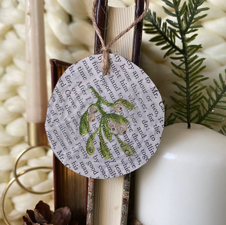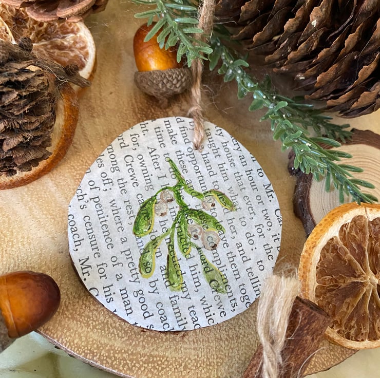 Beautifully handed painted Chistmas decorations. These are painted upon old book pages and mounted on wooden slices using string to allow them to hang giving them a rustic appearance.