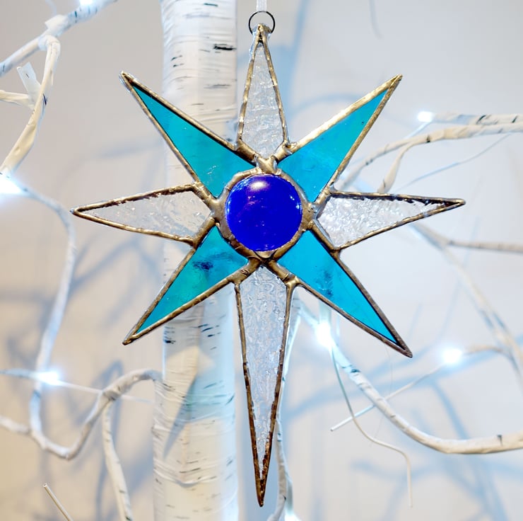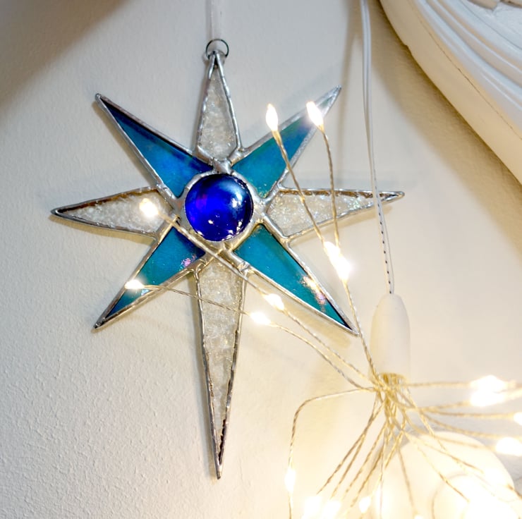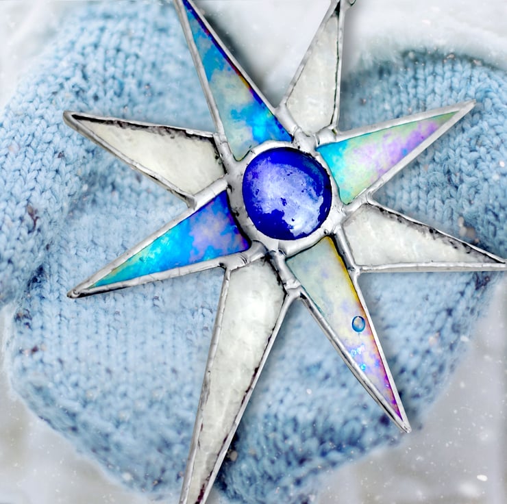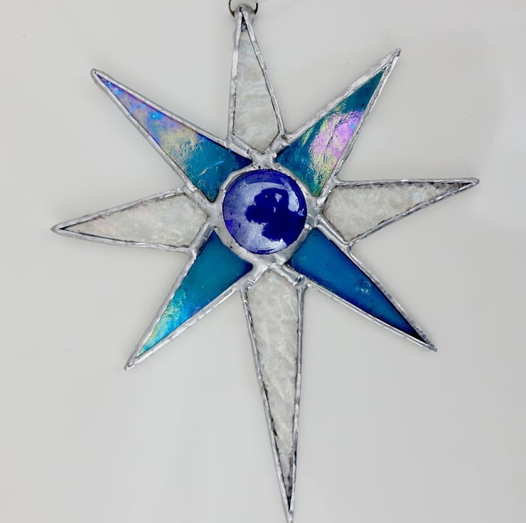 Lovely iridescent turquoise blue and textured rainbow clear stained glass star with silver chrome finish. This lovely item comes in a luxury black matt gift box - the perfect ready made and to go gift.