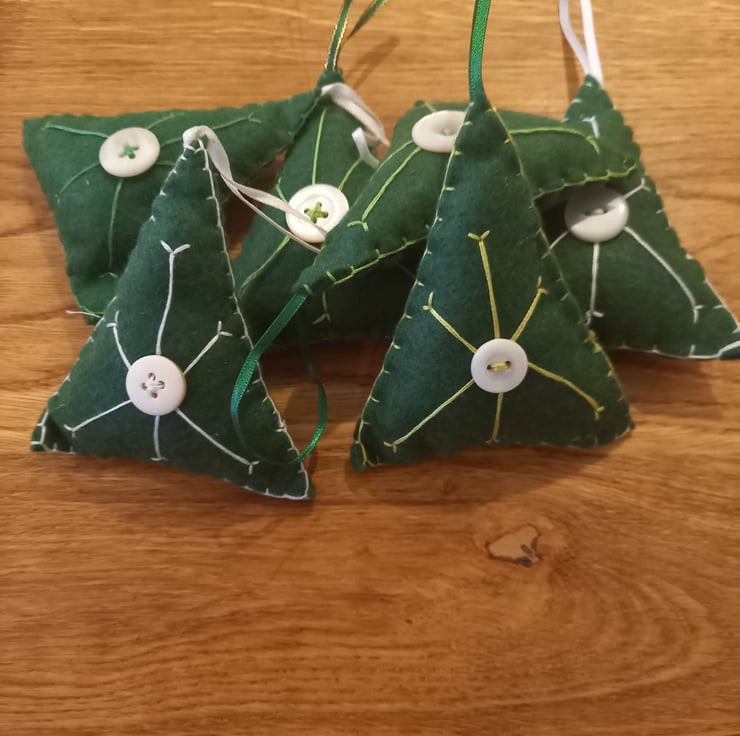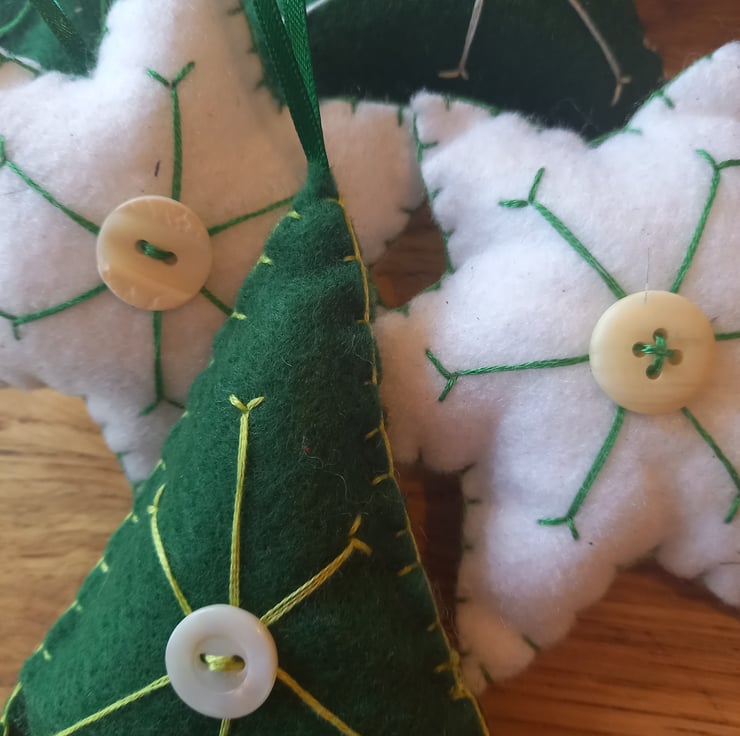 Handmade from green and white felt. Hand embroidered "snowflake" design and hand sewn closed in blanket stitch. A vintage button & hanging ribbon.