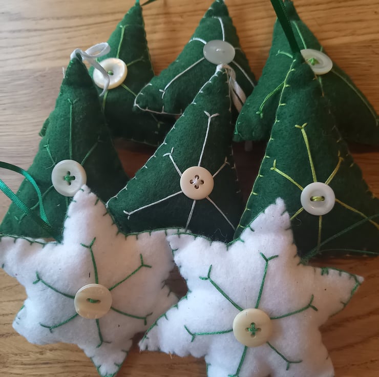 6 green trees,5 white stars.