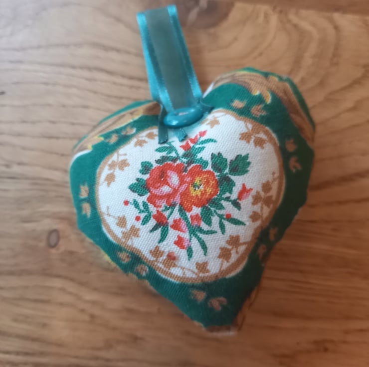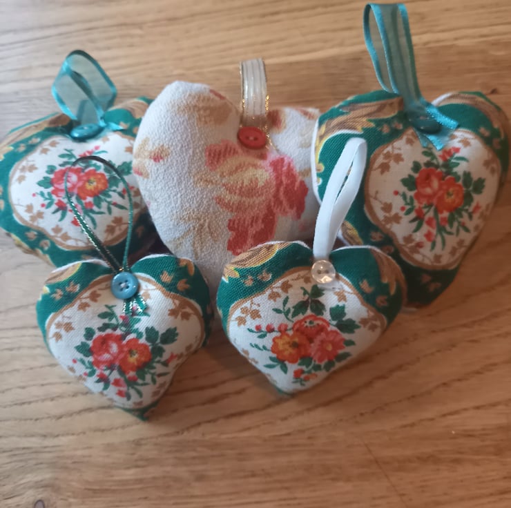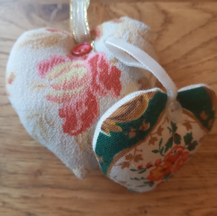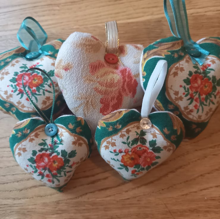 A gorgeous green vintage print and a red/cream fabric. Heart shaped,varying sizes with a vintage button & ribbon hanging loop.