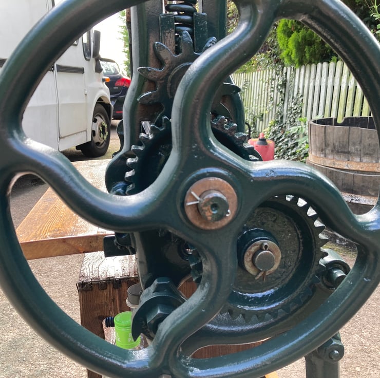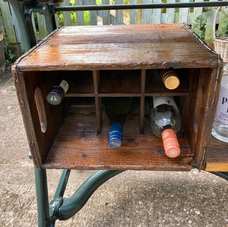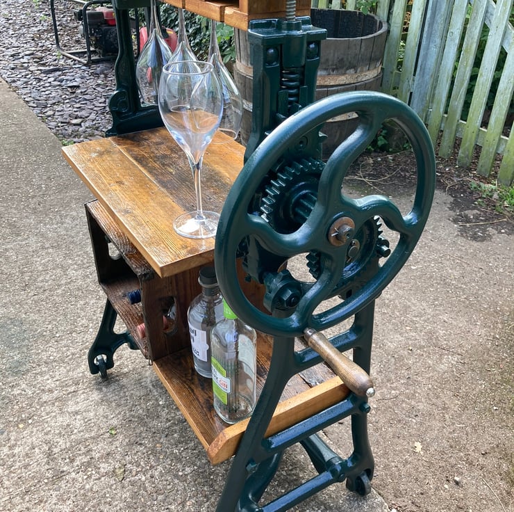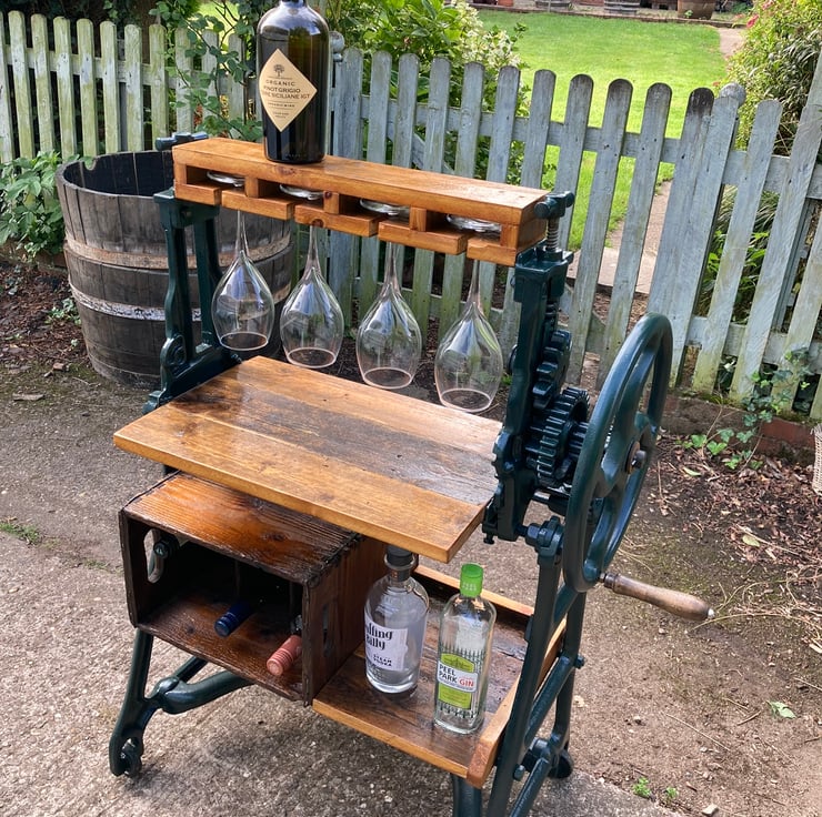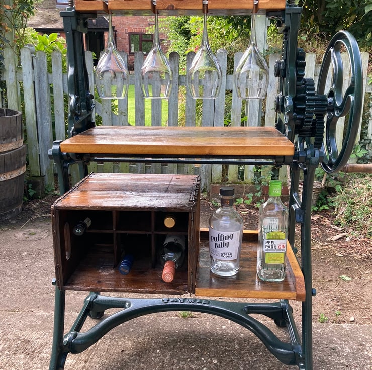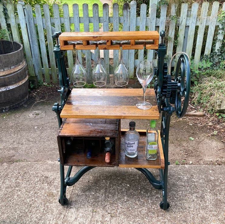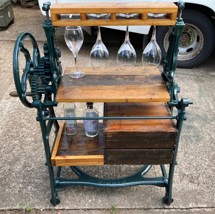 Entertain friends and family in style with this stunning feature wine and drinks bar made from a cast iron mangle, wooden bottle crate and old floorboards for the shelves. The mangle is a TayWil brand (Taylor and Wilson of Accrington) from the 1940s or 50s. The integral wine rack is a vintage 6 bottle crate with wooden dividers fixed to the framework on its side. It had a few old furniture beetle exit holes so I have given it a double dose of reputable woodworm killer. All other shelving is made from floorboards salvaged from a 1930s house undergoing a renovation. The mangle has been completely dismantled, old paint removed and a coat of dark green quality metal paint applied to finish and protect. I have cut out the original rollers and modified the remaining parts so the handle still turns the gears – wonderfully steampunk! All wood has been lightly sanded preserving the patina and then given several coats of yacht varnish. I should note that young children should not be allowed unsupervised around it because the gears could trap little fingers – and, of course, it is a drinks bar!