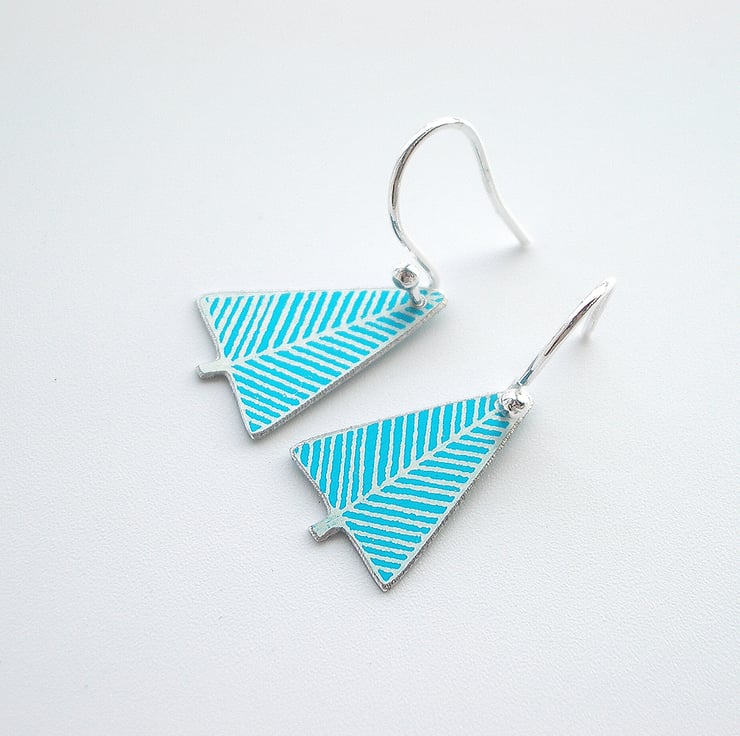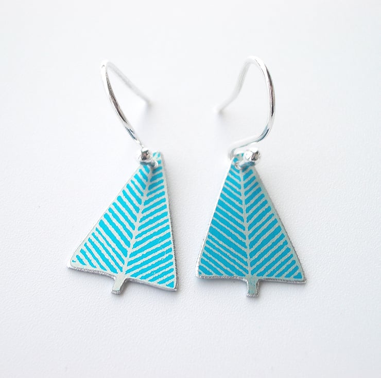 These cute scandi style Christmas tree earrings are made from aluminium which I have printed and dyed in a pretty turquoise with silver details. I file the edges to reveal the shiny aluminium on the edges which gives a nice smooth finish.